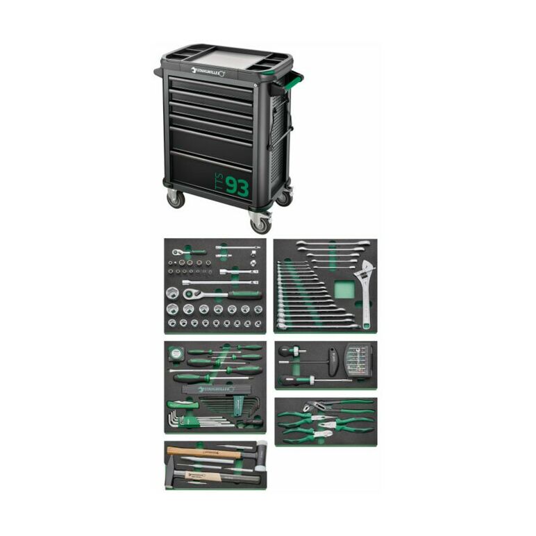 Lieferumfang:1 Werkstattwagen, anthrazit Nr. 93/6 A : 6 Schubladen11 Steckschlüsseleinsätze, 1/4" Nr. 40 : 5 | 5,5 | 6 |   7 | 8 | 9 | 10 | 11 | 12 | 13 | 14 mm17 Steckschlüsseleinsätze, 1/2" Nr. 52 : 10 | 11 | 12 | 13 | 14 | 15 | 16 | 17 | 18 | 19 | 20 | 21 | 22 | 24 | 27 | 30 | 32 mm2 QuickRelease-Verlängerungen, 1/4" Nr. 405QR : 54 | 150 mm1 QuickRelease Feinzahnknarre Nr. 415QR N : 1/4"1 Bithalter Nr. 412 : 1/4"1 Bit-Verbindungsteil Nr. 31162 QuickRelease-Verlängerungen, 1/2" Nr. 509QR : 130 | 255 mm1 QuickRelease Feinzahnknarre Nr. 512QR N : 1/2"1 Vergrößerungsstück Nr. 410 : 1/4 zu 1/2"1 Reduzierstück Nr. 512 : 1/2 zu 3/8"2 Bitratschen Nr. 4008 : Gr. 1 | 21 Bithalter Nr. 4007 : 1/4"1 Bitset Nr. 1206 : 56-teilig1 Wasserpumpenzange Nr. 6551 : 240 mm1 Seitenschneider Nr. 6602 : 160 mm1 Flachrundzange Nr. 6529 : 200 mm1 Kombizange Nr. 6501 : 180 mm16 Ringmaulschlüssel Nr. 13 : 6 | 7 | 8 | 10 | 11 | 12 | 13 | 14 | 15 | 16 | 17 | 18 | 19 | 21 | 22 | 24 mm1 verstellbarer Einmaulschlüssel Nr. 40255 Ratschen-Ringmaulschlüssel Nr. 17F : 8 | 10 | 13 | 17 | 19 mm1 Elektrikerschraubendreher Nr. 4628 : 0,4x 2,5 x 60 mm2 Schraubendreher für Schlitzschrauben Nr. 4620 : 0,8 x 4,0 x 100 | 1,6 x 10,0 x 200 mm 3 Schraubendreher für Kreuzschlitzschrauben Nr. 4630 : PH1 | PH2 | PH3 1 Kabelmesser Nr. 12320 1 Rollbandmaß Nr. 12935 : 3 m1 Mini-Magnetheber  Nr. 12600 : 270 g 1 Holzgliedermaßstab Nr. 13111 : 2 m1 Satz Kugelkopf-Winkelschraubendreher TORX® Nr. 10771/8 : T9 | T10 | T15 | T20 | T25 | T27 | T30 | T40 | 8-teilig1 Satz Winkelschraubendreher Sechskant Nr. 10765/9 : 1,5 | 2 | 2,5 | 3 | 4 | 5 | 6 | 8 | 10 mm | 9-teilig1 Schlosserhammer Nr. 10961 : 500 g 1 Schonhammer Nr. 10959 : 35 mm 1 Flachmeißel, flachoval Nr. 102/175 : 175 mm 1 Splinttreiber, achtkantig Nr. 108/150 : 150 x 6 mm 1 Körner, achtkantig Nr. 105/100 : 100 x 10 mm 1 Splinttreiber Nr. 109/6 : 3,4 mm 1 Durchtreiber, achtkantig Nr. 104/120 : 120 mm