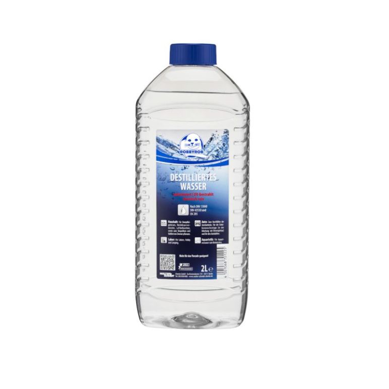 Destilliertes Wasser Robbyrob Destilliertes Wasser ist ein hochreines Wasser, das durch einen mehrstufigen Prozess hergestellt wird. Es ist entionisiert, das heißt, alle Mineralien und Salze wurden entfernt, und es wurde auch durch UV-Strahlung behandelt, um potenzielle Mikroorganismen zu eliminieren. Das Wasser entspricht der DIN 43 530 (VDE 0510) sowie der EN 285, was bedeutet, dass es den strengen Anforderungen der deutschen und europäischen Normen entspricht. Dieses Wasser eignet sich ideal für den Einsatz im Haushalt, beispielsweise für Dampfbügeleisen, Luftbefeuchter, Heizkörperverdunster, zum Besprühen und Gießen von Zimmerpflanzen sowie für die Auto-Scheibenwaschanlage zur Verdünnung von Scheibenreiniger-Konzentraten und zum Nachfüllen der Autobatterie. Es ist auch geeignet für den Einsatz in Laboren, Kosmetikstudios, Hobby und Camping oder zum Beimischen für Aquarien. Ein besonderer Vorteil dieses Wassers ist, dass es keine Kalkablagerungen hinterlässt, was es ideal für den Einsatz in Haushaltsgeräten und Autowaschanlagen macht. Es ist in verschiedenen Größen erhältlich, darunter 1 Liter, 2 Liter und 5 Liter. Besonderheiten: Robbyrob Destilliertes Wasser Entionisiert, UV-bestrahlt, chemisch rein Entspricht der DIN 43 530 (VDE 0510) sowie der EN 285 Keine Kalkablagerungen Einsatzgebiete im Haushalt: Dampfbügeleisen, Luftbefeuchter, Heizkörperverdunster, Besprühen und Gießen von Zimmerpflanzen, Auto-Scheibenwaschanlage, Autokühler, Nachfüllen der Autobatterie Weitere Einsatzgebiete: Labore, Kosmetikstudios, Hobby und Camping, Aquarien Erhältlich in 1 Liter, 2 Liter und 5 Liter