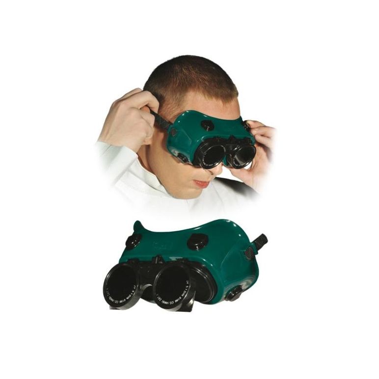 Schweißerbrille mit runden klappbaren Scheiben   Schweißbrille mit runden Scheiben mit verstellbarem Gummiband Klasse 1 Schutzgläser auf zwei Seiten der Filter montiert Schutz-und Filterscheiben sind austauschbar Schutz vor kleine feste Teilchen erfüllen die Anforderungen der EN175 und EN166 mit Klappvisier Farbe: grün, schwarz Größe: universal