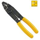 Crimpzange für verschiedene Kabel und Aderendhülsen Mit dieser Kabelschuhzange durchtrennen, crimpen und abisolieren Sie verschiedenste Kabel von einem Durchmesser 1-7mm sowie Gewinde M 2,6- M4 . Abgerundet wird das Produkt durch den ergonomisch geformten, gummierten Griff, welches das Arbeiten erheblich erleichtert. geeignet für isolierte und nicht isolierte Kabel (blau/rot/gelb) Durchmesser: 1-7mm Gewindeabscherer: M 2,6 - M4 ergonomisch geformter, gummierter Griff Länge: 210mm Gewicht: 222g Farbe: schwarz/gelb
