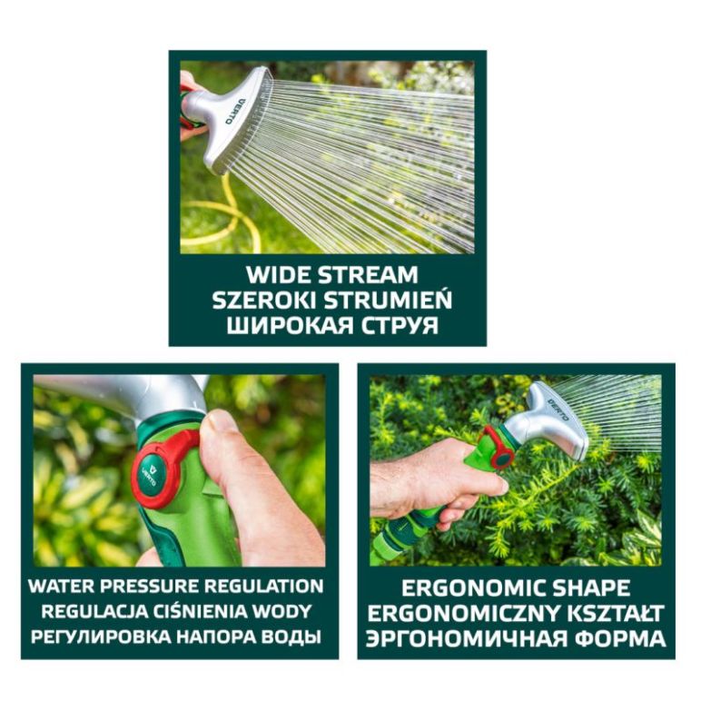 Die stufenlos regulierbare Gartenbrause Mit ihrem gummierten, ergonomischen Griff rutscht die Brause nicht aus der Hand. Der Regler, um die Wassermenge anzupassen, ist mit dem Daumen leicht zu erreichen und einfach zu bedienen. Technische Merkmale: Breiter Strahl Ergonomischer Griff Wasserdruckregulierung Große Reichweite