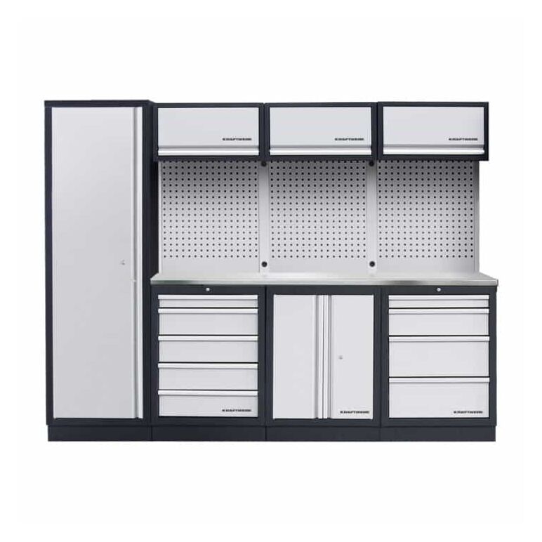 • 1 Arbeitsplatzschrank mit 5 Schubladen. 1 Arbeitsplatzschrank mit 4 Schubladen. 3 Werkzeug-Lochwände