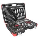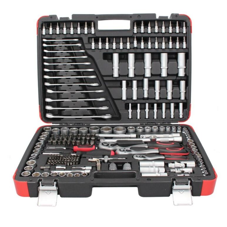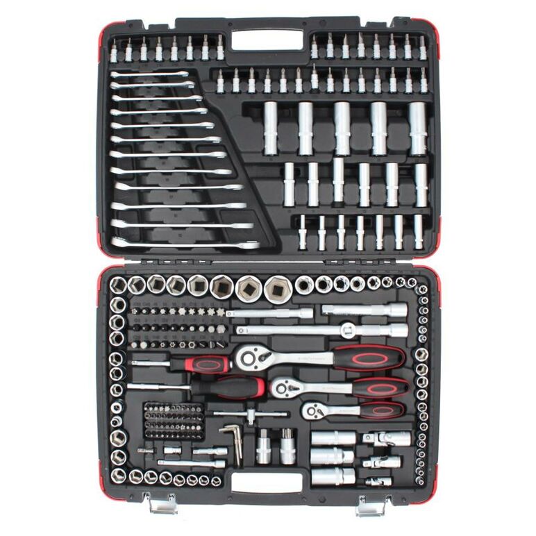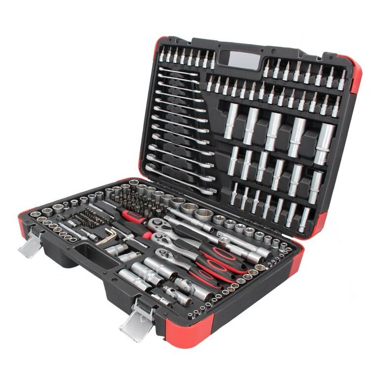 Die Firma BGS technic bietet hier einen 216-teiligen Steckschlüssel Satz mit 3 unterschiedlichen Knarren ( 1/4", 3/8" und 1/2" ). Durch eine breite Auswahl an unterschiedlichen Aufsätzen und Verlängerungen, hat man hier für viele Einsatzgebiete das passende Werkzeug zur Hand. Die Werkzeuge sind aus Chrom Vanadium Stahl gefertigt was für eine hohe Langlebigkeit und Bruchsicherheit sorgt. Durch das Pro Torque Profil ( Sechskant ) der Bits findet eine optimale Kraftübertragung auf die Schraube statt, wodurch der Abrieb verringert wird. Weiterhin sind 12 Maul-Ringschlüssel und 7 Winkelschlüssel enthalten um das Paket an hochwertigen Werkzeugen zu ergänzen. BGS technic ist ein führender Hersteller für Handwerkzeug, eine hohe Verarbeitungsqualität und lange Tradition zeichnen das Unternehmen aus.