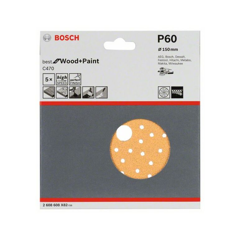 Bosch Schleifblatt C470, 150 mm, 60, Multilochung, Klett, 5er-Pack, Best for Wood and Paint