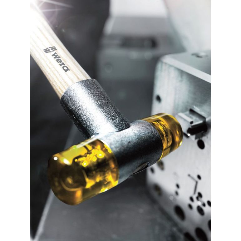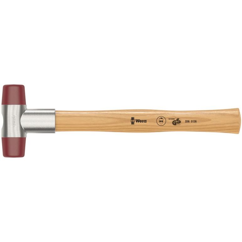 Wera Schonhammer: Zweiseitig konische Konstruktion für eine sichere unlösbare Verbindung zwischen Hammerstiel und Kopf. Hammerkopf aus mittelhartem Uretan. Stiel aus hochwertigem Eschenholz. Variabler Einsatz dank nachrüstbarer Schonhammerköpfe. Für Karosseriebau, Maschinenbau, KFZ-Bereich.