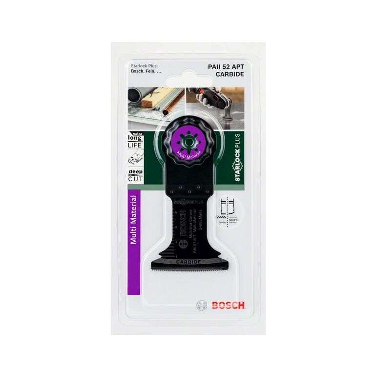 Präzisionsblatt PAII 52 APT MultiMax. Das Präzisionsblatt Starlock PAII 52 APT MultiMax sorgt für Präzisionsschnitte beim Arbeiten mit gehärtetem Metall. Seine hochwertigen Hartmetallzähne zertrennen abrasives und hartes Material bei höchster Verschleißfestigkeit. Die abgerundete Blattspitze (Curved-Tec) mit einer Breite von 52 mm erhöht die Haltbarkeit, indem Zahnbruch verhindert wird. Zugleich ermöglicht sie besonders breite Tauchschnitte in Metall und abrasiven Materialien ohne Rattermarken und Abplatzungen. Das Blatt schneidet durch Metallbleche, abrasive Materialien wie Epoxidharz, GFK (glasfaserverstärkter Kunststoff), CFK (kohlefaserverstärkter Kunststoff), Gipskartonplatten, Zementfaserplatten und faserverstärkte Kunststoffe. Es ist für alle Starlock Plus- und Starlock Max-Multifunktionswerkzeuge geeignet. Das System Starlock Plus ermöglicht sehr schnelle, tiefe und vielfältige Tauchschnitte. Zudem ermöglicht das Starlock-Aufnahmesystem schnelle Blattwechsel in drei Sekunden ohne Blattberührung. Das spezielle Starlock-Aufnahmesystem ermöglicht durch seine dreidimensionale enge Passung maximale Kraftübertragung zwischen Maschine und Zubehör.