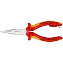 Geeignet für feinere Greif- und Schneidarbeiten. Flach-runde, lange, spitz zulaufende Backen. Greifflächen gezahnt. Mit Schneiden für weichen, mittelharten und harten Draht. Schneiden zusätzlich induktiv gehärtet, Schneidenhärte ca. 61 HRC. Zange mit integrierter isolierter Befestigungsöse zum Anbringen einer Absturzsicherung.