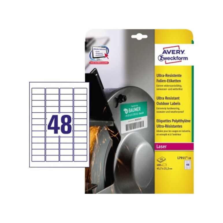 Die ultra-resistenten Folien-Etiketten von AVERY ZWECKFORM zeichnen sich durch eine hohe Strapazierfähigkeit für höchste Beanspruchungen im Innen- und Außenraum aus. Durch die Haftung auch auf schwierigen Oberflächen, eignen sie sich besonders zur Kennzeichnung in der Produktion und im Lager, zur Beschriftung von Containern oder zur Beschilderung. Die Folienetiketten sind ultra-widerstandsfähig. Zudem sind die Etiketten resistent gegen viele Lösungs- und Reinigungsmittel. Gestalten und drucken Sie Ihre Aufkleber schnell und einfach - mit den kostenlosen Avery Zweckform Etiketten Vorlagen und Software-Lösungen unter www.avery-zweckform.eu/print oder den im Microsoft® Office Paket integrierten Basis-Vorlagen.