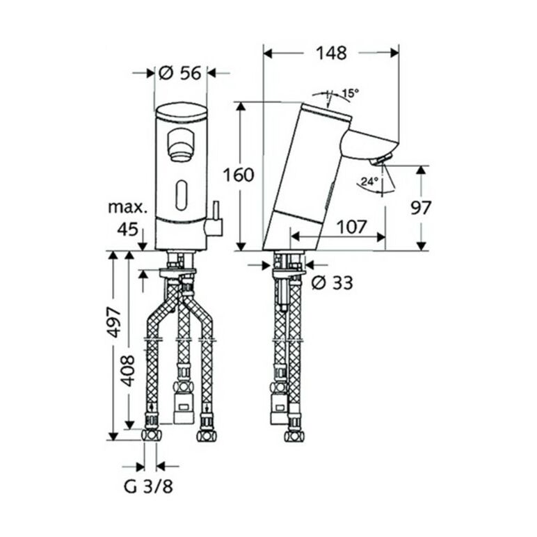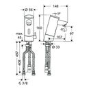 Niederdruck · Mischwasser · parametrierbar über SSC · mit Umrüst-Set geeignet zur Vernetzung mit SWS (Offene Warmwasserspeicher) · vandalengeschützte Ganzmetallausführung · Lieferumfang: Infrarot-Sensor-Einlocharmatur mit Temperaturregler · Elektronikmodul programmierbar · Anschlusskabel mit Stecker · Kartuschenmagnetventil 6 V · Batteriefach in Armatur integriert · 3x flexible Anschlussschläuche Clean-Fix S G 3/8″ IG x 380/500 mm · Vorfilter mit Durchflussbegrenzer · Strahlregler · BefestigungsmaterialWeitere technische Eigenschaften:· Anschluss Vorlauf: Schlauch (Verschraubung)· Anschlussmaß Zufuhr: 3/8 Zoll· Anzahl der Armaturenlöcher: 1-löchig· Aufbauhöhe gesamt: 160mm· Aufbauhöhe Unterkante Hahnauslass: 97mm· Auslauftyp: gegossen· Mit Temperaturbegrenzung: Nein· Niederdruckausführung: Ja· Oberflächenbehandlung: poliert· Oberflächenschutz: verchromt· Rückflusssicherung nach EN 1717: AA, ohne Rückstromschutz· Thermostatisch: Nein· Vorsprung Ablauf: 107mm