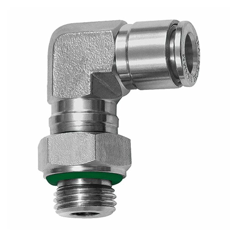 - L-Steckverschraubung, drehbar, G 1/4 a., für Schlauch-Außen-Ø 8 mm, Arbeitsdruck max. 20 bar, Edelstahl 1.4404. Für den Einsatz in aggressiveren Umgebungen und bei korrosiven Medien