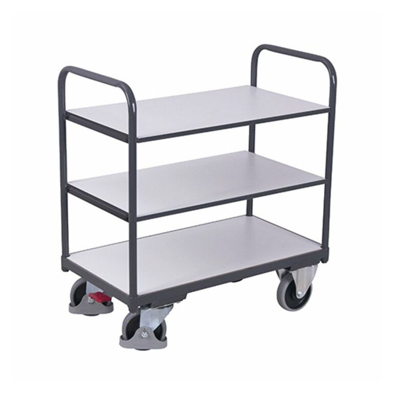 - Radsatz:Bereifung aus elektrisch leitfähigem Vollgummi auf Kunststofffelge mit Präzisions-Rillenkugellager, grau, Ø 160 mm, 2 Lenkrollen mit Zentralbremse EasySTOP und 2 Bockrollen, Lenkrollen mit Fußschutz