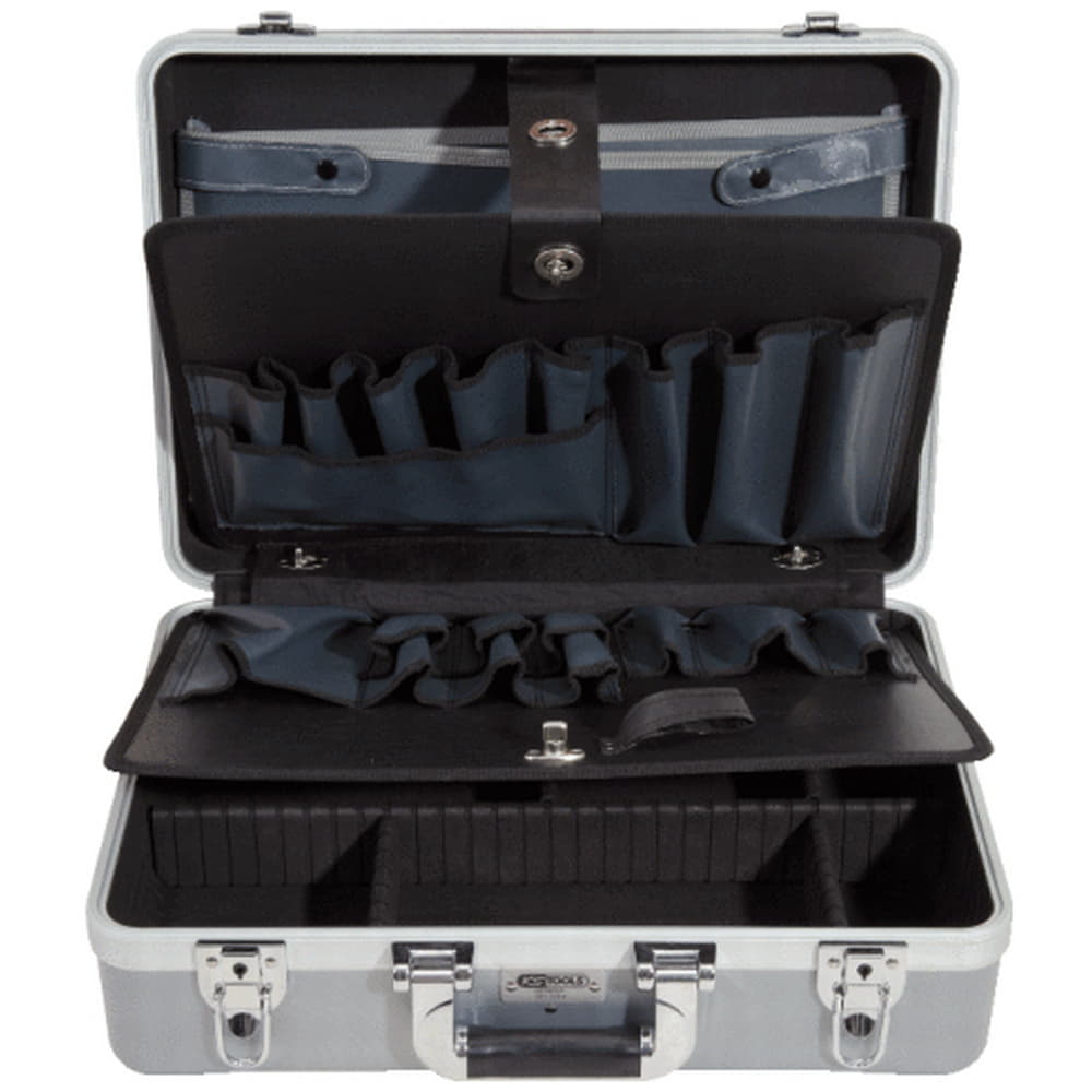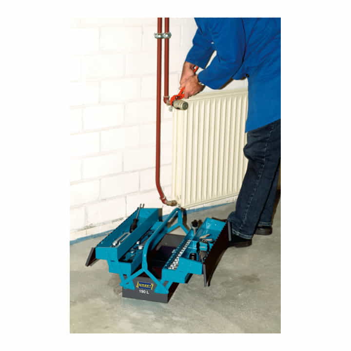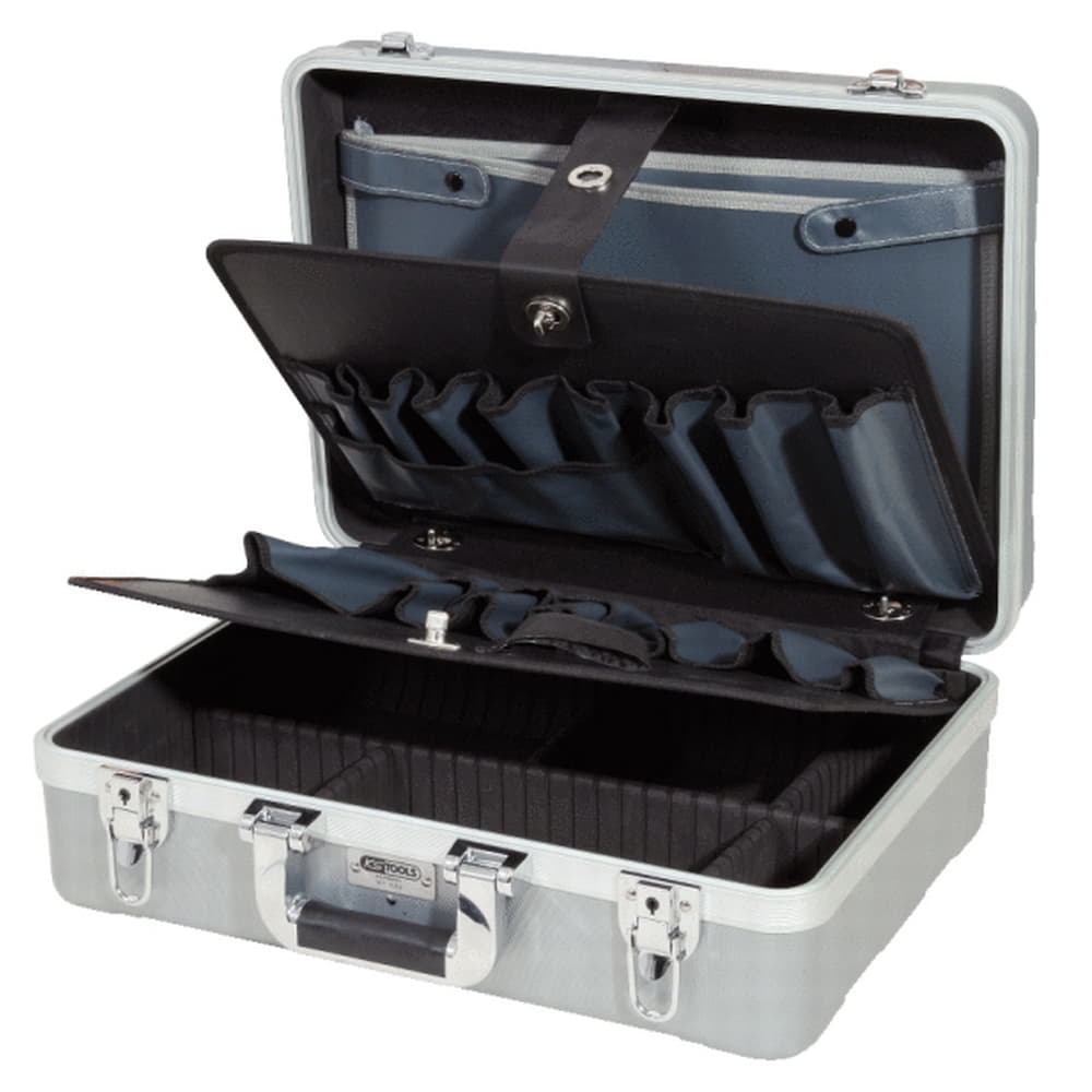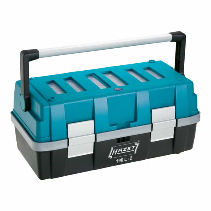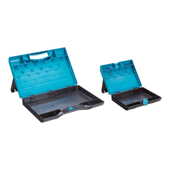 Umklappbare Frontseite ermöglicht leichten Zugriff auf das Werkzeug, durch 2 seitliche Steckschlösser gegen versehentliches Öffnen gesichert