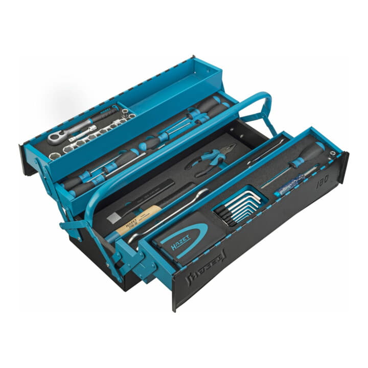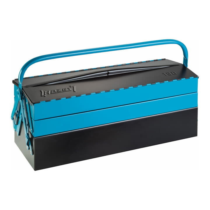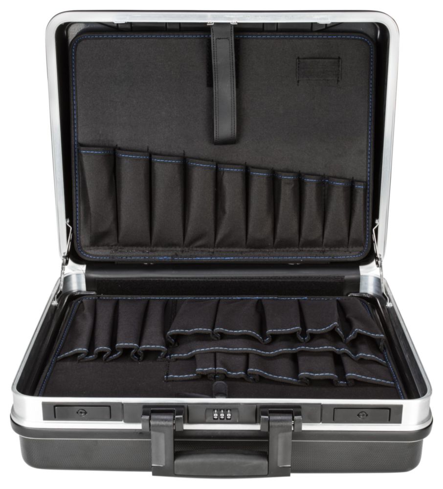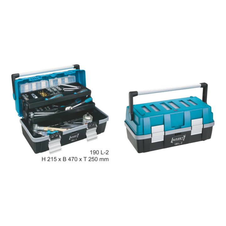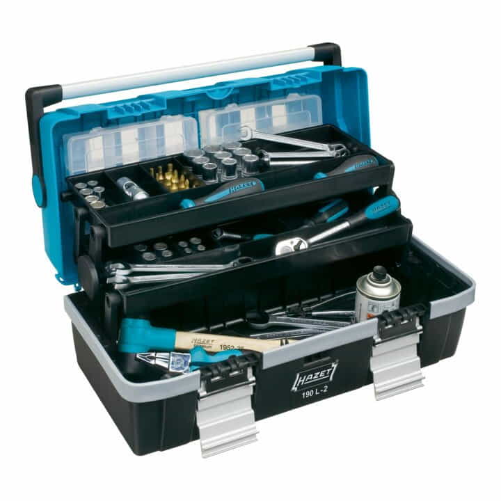 Umklappbare Frontseite ermöglicht leichten Zugriff auf das Werkzeug, durch 2 seitliche Steckschlösser gegen versehentliches Öffnen gesichert