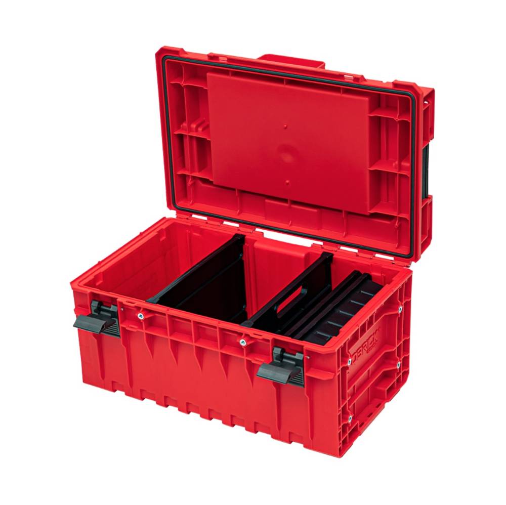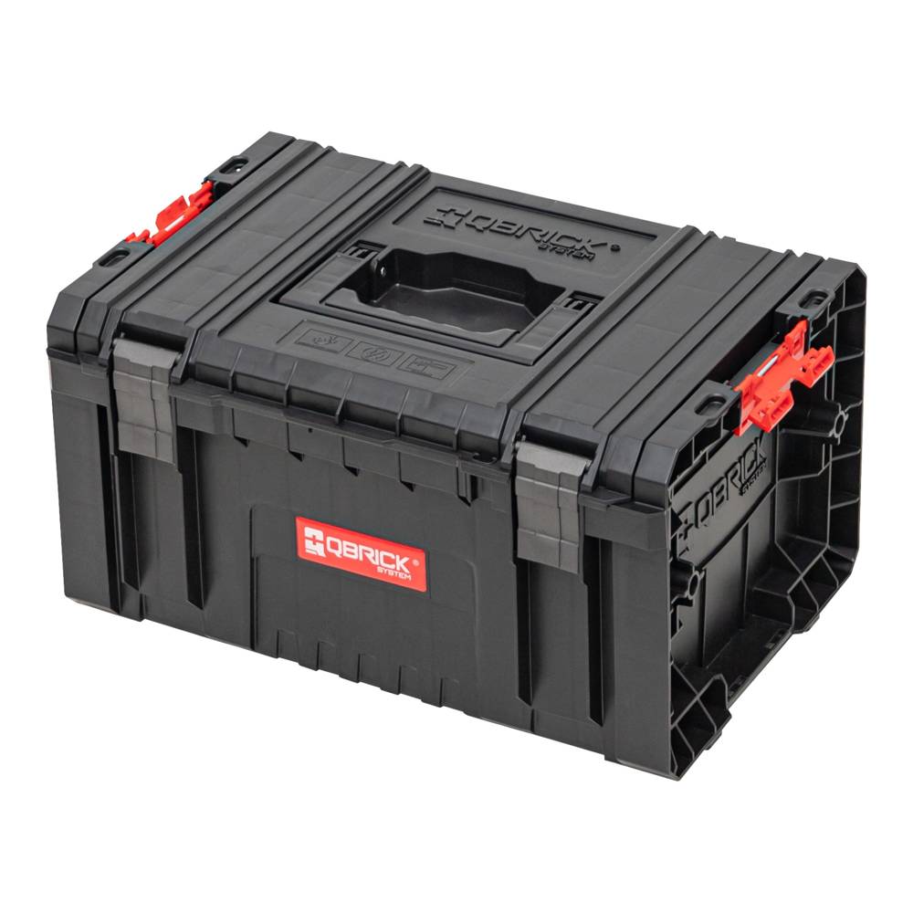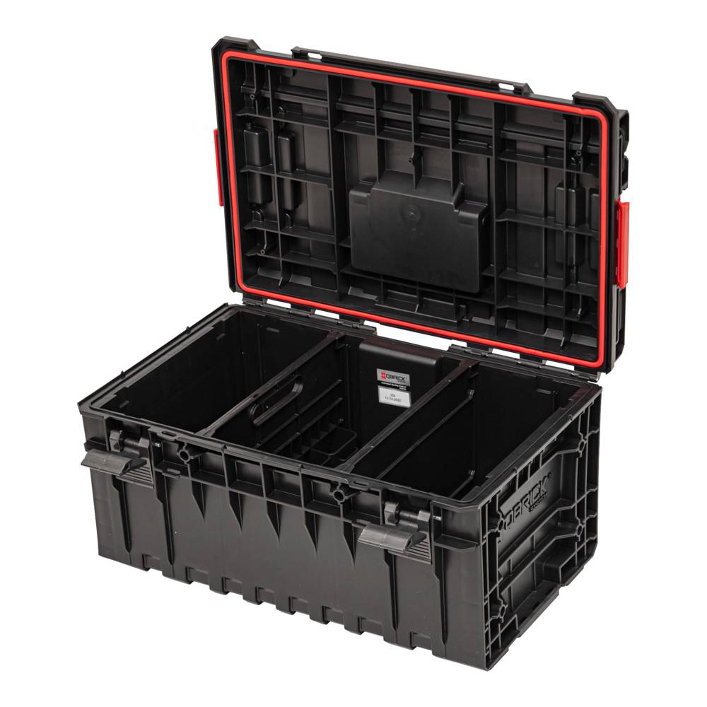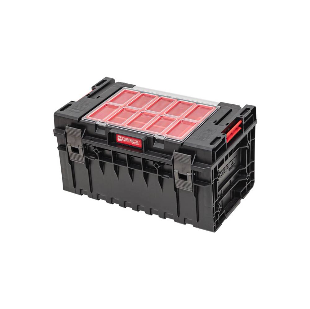 Der ONE 350 ist ein großer Werkzeugkoffer mit einem Fassungsvermögen von 38 Litern. Dank dessen ist es in der Lage, große Elektrowerkzeuge und Handwerkzeuge aufzunehmen. Jede Box ist mit einer flexiblen Dichtung ausgestattet, die vollen Schutz gegen das Eindringen von Staub und Wasser bietet (IP66). Sie ist mit zwei verstellbaren Fächern ausgestattet – ein normales Fach und ein zweites Multi-Fach, das dank der differenzierten Halterungen für Handwerkszeug die Ordnung im Inneren der Box erleichtert. Das herausnehmbare Multifach kann als eigenständiger Werkzeugträger verwendet werden. Der Profi-Deckel ist serienmäßig mit zwei geräumigen Organizern mit beweglichen Trennwänden und stoßfesten Polycarbonat-Schiebern ausgestattet. Die verstärkte Struktur der Abdeckung und des Körpers garantiert eine hohe Tragfähigkeit (50 kg) und hält einem Druck von bis zu 120 kg stand, wodurch komfortable Arbeitsplattformen geschaffen werden können. Die Version 2.0 der Produktlinie Qbrick System ONE ist eine neue Generation von Werkzeugkästen und Organizern mit einem verstärkten Design. Durch die zusätzliche Anpassung der Gehäuse an M8-Gewindeeinsätze kann das System an die Bedürfnisse des Anwenders angepasst werden.