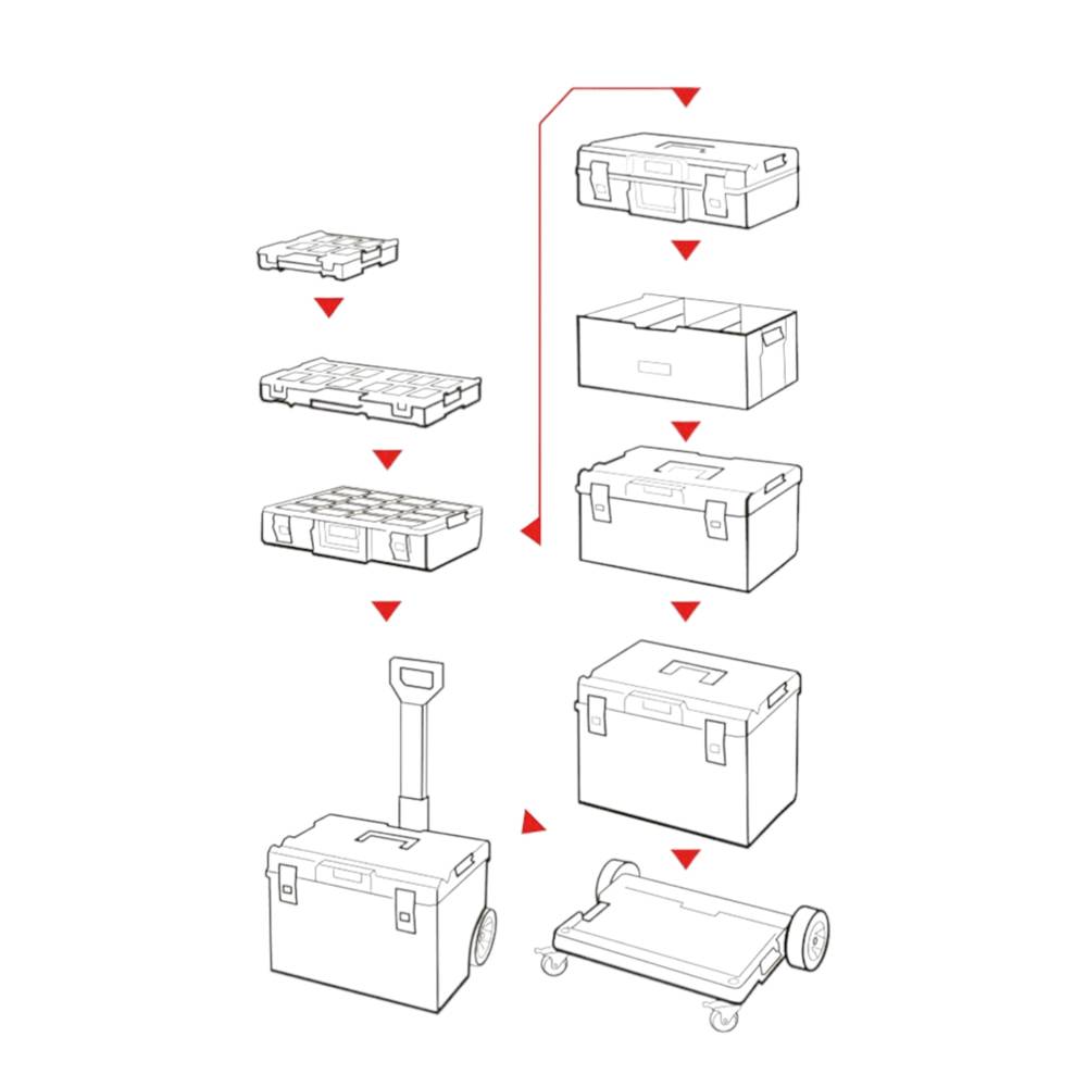 Das Cart 2.0 bietet eine robuste Basis für das Set, mit einer beeindruckenden Tragfähigkeit von bis zu 100 kg und einem großzügigen Fassungsvermögen von 52 Litern. Ausgestattet mit einem abnehmbaren Teleskopstiel und großen, leisen Rädern ist der Transport selbst schwerster Werkzeuge mühelos. Zwei verstellbare Trennwände und Ablagen ermöglichen eine flexible Organisation. IP66-zertifizierter Schutz gewährleistet Sicherheit unter allen Bedingungen.