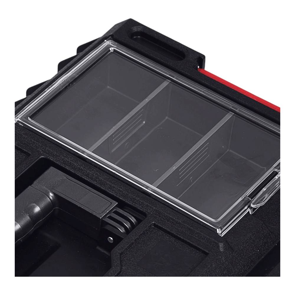Der ONE 200 2.0 Technik vereint die Eigenschaften eines Werkzeugbehälters mit einem Organizer. Mit verstellbaren Trennwänden und herausnehmbaren Eimern kann der Benutzer seine optimale Werkzeugkombination zusammenstellen. IP66-zertifizierte Dichtungen bieten vollen Schutz, während die Aluminium-Montageschienen die Nutzung als Arbeitsplattform ermöglichen. Die mitgelieferten QS PRO Connect Adapter erlauben die Anpassung an andere Module der PRO-Linie.