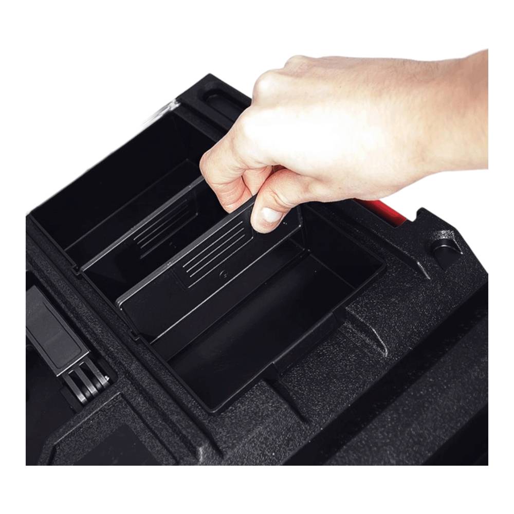 Der PRO 700 ist das größte Modell, mit dem Sie große Werkzeuge sicher transportieren und aufbewahren können. Indem Sie zwei Boxen miteinander verbinden, können Sie eine Vielzahl von Werkzeugen mit nur einer Hand transportieren. Der große Expert-Organizer im Deckel der Box hat 11 Kammern mit verstellbaren Trennwänden und bietet Platz für eine Wasserwaage, lange Bohrer und kleineres Zubehör.