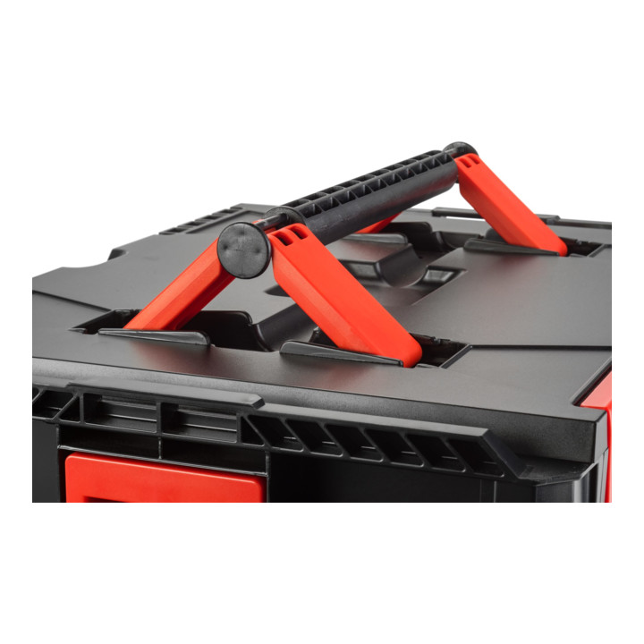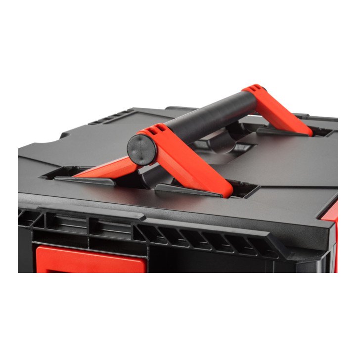 Die mobile Werkzeugkiste ermöglicht den Transport langer Elektrowerkzeuge wie Hammerhämmer, Winkelschleifer oder Betonmischer mit dem nötigen Zubehör. Sie ist mit drei verstellbaren Fächern ausgestattet – darunter ein Multi-Fach, das dank der differenzierten Halterungen für Handwerkszeug für Ordnung im Inneren der Box sorgt. Seine überdurchschnittlichen Abmessungen machen es zu einem einzigartigen Produkt in seiner Kategorie.
