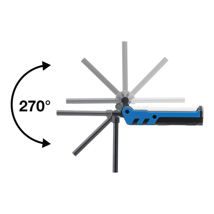 Beidseitig ausklappbare Haken, starker Magnet am 45° verstellbarem Fuß und starker Minimagnet an der Spitze um verloren gegangene Kleinteile an engen Stellen hervorzuholen