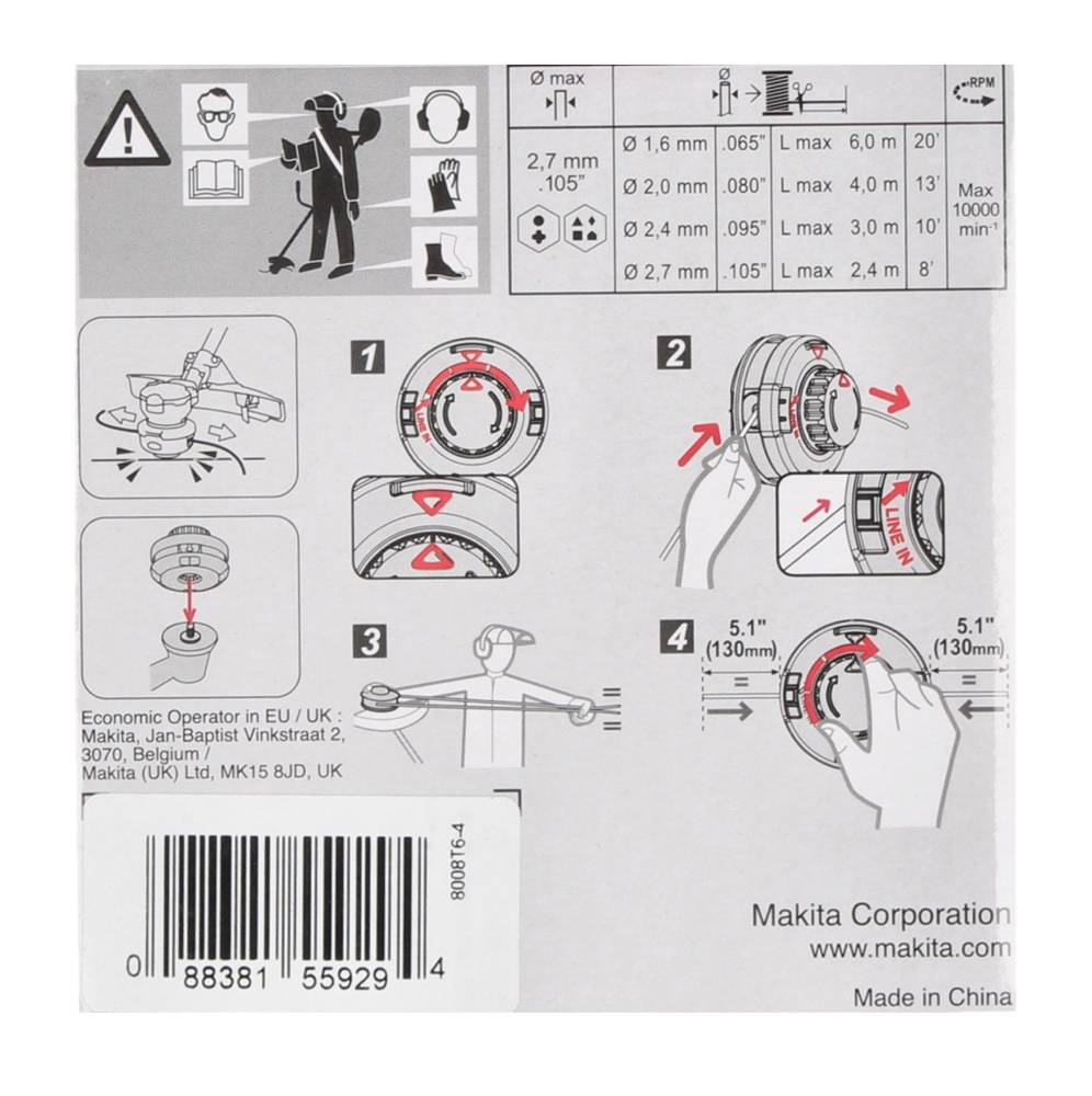 Die Firma Makita bietet hier mit dem 2-Fadenkopf Tap&Go einen Fadenkopf der für 2,4 mm starke Fäden ausgelegt ist. Der bereits aufgezogene Faden besteht einem hochwertigen und reißfesten Kunststoff. Durch die dünnen und biegsamen Fäden kann man beispielsweise an Hauswänden, Mauern, Holzzäunen oder ähnlichem präzise entlang schneiden, ohne diese zu beschädigen. Makita verbindet eine lange Tradition zu Werkzeugen aller Art, darüber hinaus besitzt Makita ein großes 18 Volt Akkusystem mit über 380 kompatiblen Geräten.
