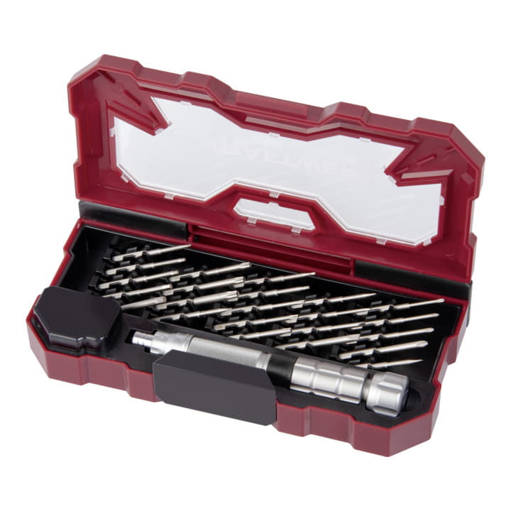 - 36x 25mm Schrauberbits (2x PH1, 3x PH2, 2x PH3, 2x PZ1, 11x PZ2, 2x PZ3, T10,T15,T20,T25,T30,T40, H4, H5, H6, H7mm, SL4, SL4,5, SL5, SL7)