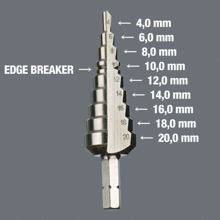 Hochwertiger Stufenbohrer-Bit von Wera. 9 Bohrstufen 2 mm steigend, einsetzbar in Material bis 4,5 mm Stärke. Mit Kantenbrecher für 1 mm Bleche. Passend für 1/4" Sechskant, passend für Halter nach DIN ISO 1173-D 6,3.