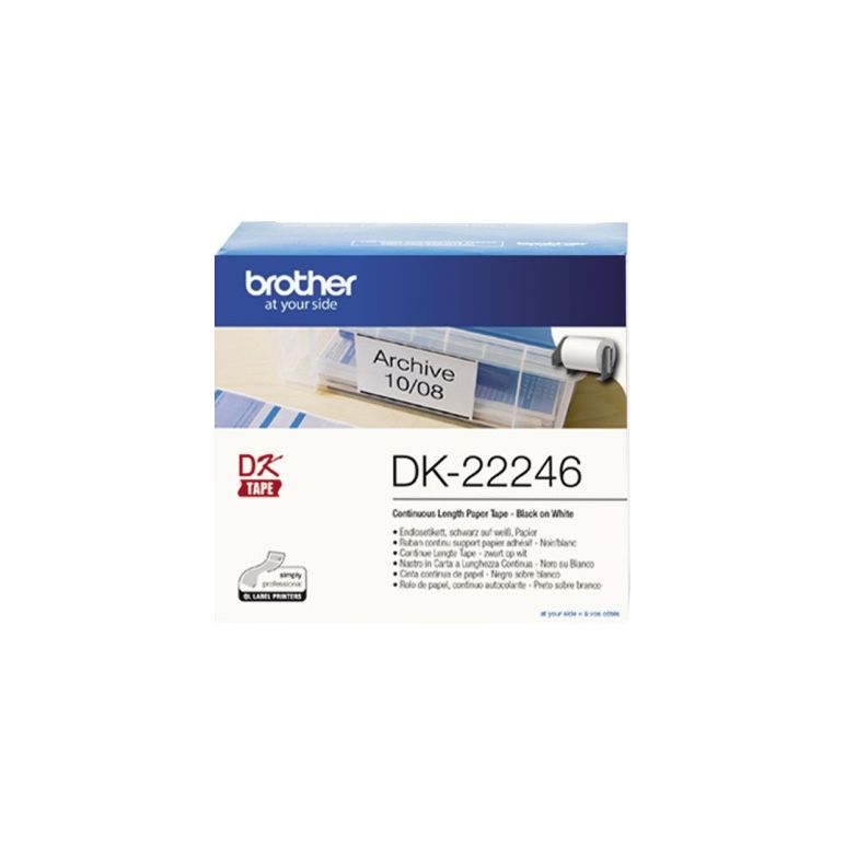 Mit der Original Brother DK-22246 Endlosetikettenrolle mit schwarzer Schrift auf weißem Hintergrund können Sie selbstklebende Papieretiketten aller Art und in beliebiger Länge erstellen. Diese Etiketten sind besonders für den Druck von extra breiten Versandetiketten geeignet.