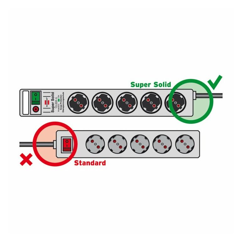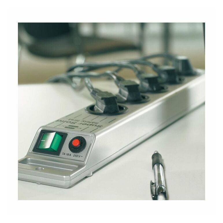 Brennenstuhl - Super-Solid Line 5-fach silber 2,5 m H05VV-F 3G1,5Super-Solid Line 5-fach silber 2,5 m H05VV-F 3G1,5 von Brennenstuhl aus der Kategorie: Steckdosenleisten, Schaltgeräte & Adapter > Super-Solid-Line mit der Artikelnummer: 1153340115 von Hugo Brennenstuhl und der EAN: 4007123174102 • Sehr stabil konstruierte Steckdosenleiste aus hochbruchfestem Polycarbonat. • Sicherheitsschalter beleuchtet, zweipolig ein-/ausschaltbar. • Schutzkontakt-Steckdosen in 45°-Anordnung, auch für Winkelstecker. • Die Abstände ermöglichen den Betrieb von Netzgeräten. • Mit Aufhänge-Vorrichtung; sehr gut anschraubbar durch Schraubführungen. • Besonderheit: Kabeleingang gegenüber dem Schalter, dadurch praktische Bedienung z.B. unter dem Schreibtisch. • Gummifüße verhindern Wegrutschen. • Steckdosen mit Kinderschutz. • Kabellänge: 2,5 m • Kabelbezeichnung: H05VV-F 3G1,5 • Länge ca.: 44,5 cm • Steckdosen: 5 • Farbe: Silber • Stecksystem: DE