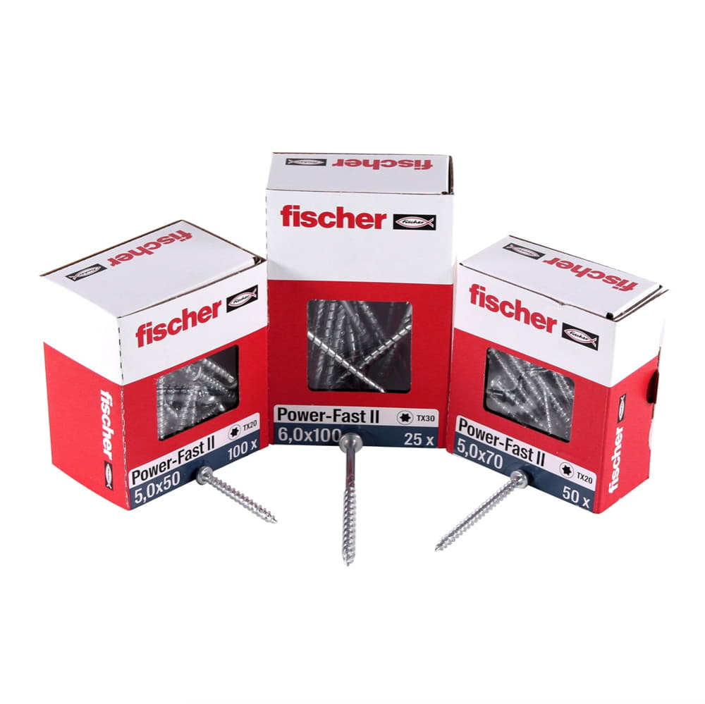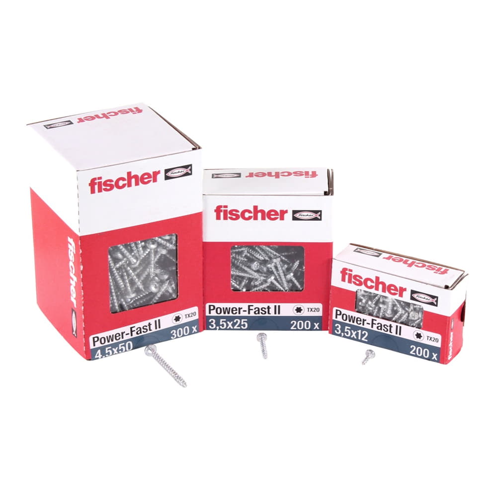Die Spanplattenschrauben eignen sich für Befestigungen von tragenden Bauteilen in beschichtetem Holz, Hartholz, Weichholz und Holzverbindungen. Die Schrauben mit Teilgewinde sorgen für kraftvolle Verbindungen und ein festes Aneinanderziehen in allen Hölzern aber auch zum beschädigungsfreien befestigen von Metallteilen auf Holz. Die Power-Fast II sind Schrauben mit geprüften Lasten im fischer Dübel (z. B. DUOPOWER und UX). Fischer ist mit diesen Schrauben die ideale Lösung für einen sauberen Oberflächenabschluss mit weniger Beschädigung des Metalls gelungen. Die Schraubenspitze mit den drei Rippen sorgt für ein schnelles Anbissverhalten und Vorfräsen. Die Spanplattenschrauben haben ein deutlich reduziertes Spaltverhalten im Vergleich zu handelsüblichen Schrauben. Die Power-Fast II mit Hochleistungs-Wachsbeschichtung vermindern das Einschraubdrehmoment und erlauben problemlos ein randnahes Verschrauben. Die Unterkopfgeometrie mit optimiertem Doppelkonus und Frästaschen sorgen für weniger aufgerissene Holzoberflächen und weniger Beschädigungen auf Metallbauteilen. Und damit für eine bessere Optik und Haptik der Oberflächen. Die erhöhte Gewindesteigung reduziert die Einschraubzeit deutlich und ermöglicht eine schnelle Montage. Die Schaftfräsrippen in Kombination mit der Kernfräsergeometrie reduzieren den Einschraubwiderstand spürbar. So können mit einer längeren Akkulaufzeit und weniger Kraftaufwand mehr Schrauben eingeschraubt werden. Die neuartige Kernfräsergeometrie ermöglicht ein präzises Fräsen und optimales Herausarbeiten des Holzmehls. Damit sind geringe Rand- und Achsabstände möglich. Die galvanische Verzinkung, blau passiviert, enthält keine Chrom VI Anteile und ist damit sehr umweltverträglich. Die neue Power-Fast II mit ihrer einzigartigen Schraubengeometrie vereint höchstes technisches Know-How mit ausgezeichnetem Design. Power Fast II sind die Spanplattenschrauben für eine schnelle und flexible Verarbeitung.