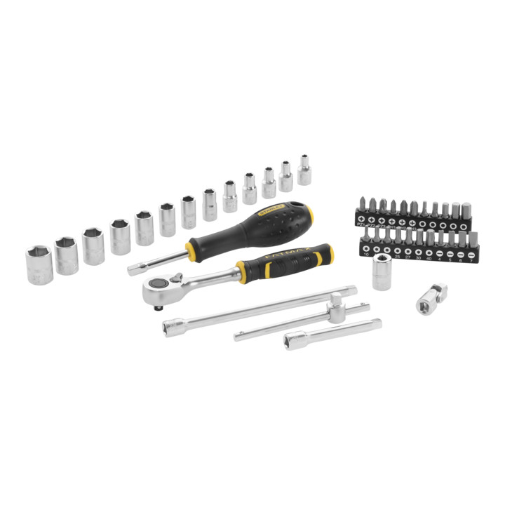VARIABLE GRUNDAUSSTATTUNG: Der Koffer enthält Umschaltknarren 1/2inches + 1/4inches inkl. Verlängerung, Adapter, Kardangelenk, Schraubendreher, Hammer, Zange und sechskant Steckschlüssel mit UD-Profil.