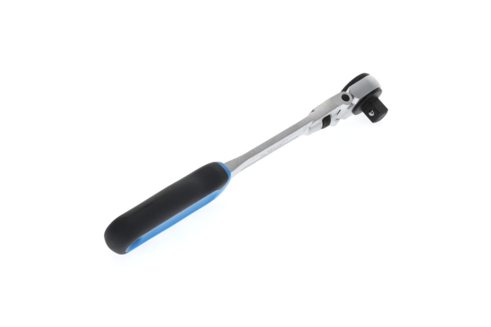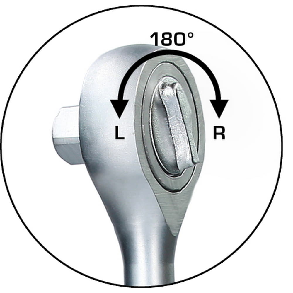KOMFORTABLE HANDHABUNG: Die Umschaltknarre mit 2-Komponenten-Griff besitzt einen um 180° schwenkbaren Kopf mit Gelenkfeststellung. Die Kugelarretierung erleichtert zusätzlich die Arbeit.