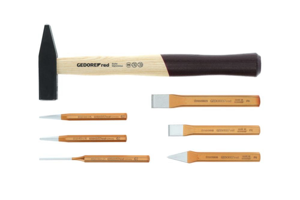LIEFERUMFANG: 1 x GEDORE red Hammer-/Meißelsatz 2/6 CT-Modul, 7 teilig, Länge: 310 mm, Gewicht: 1222 g, Artikelnummer: R22150019