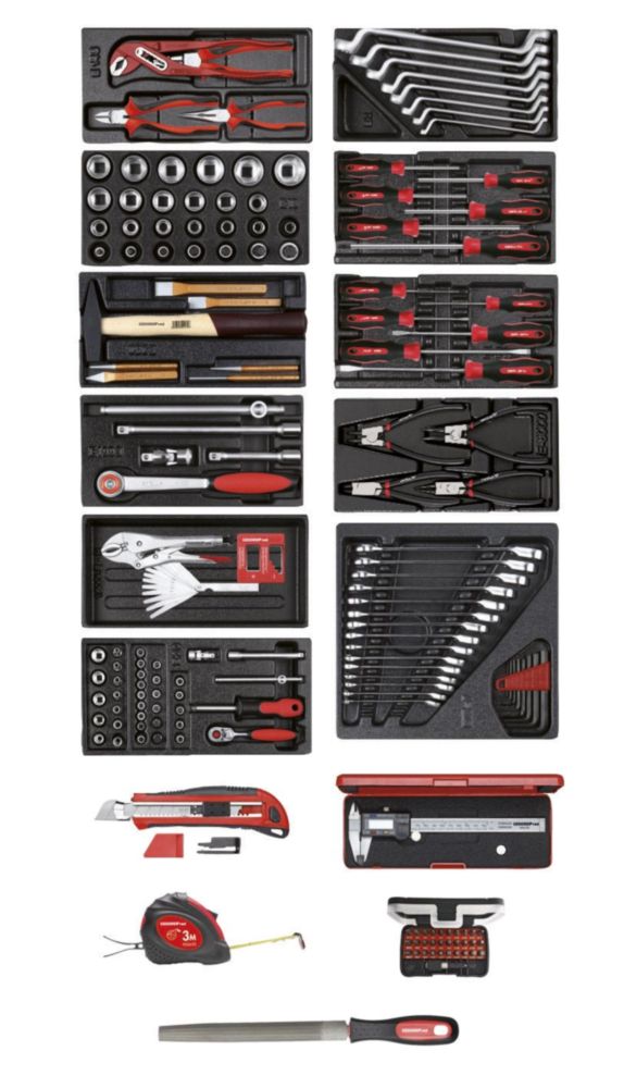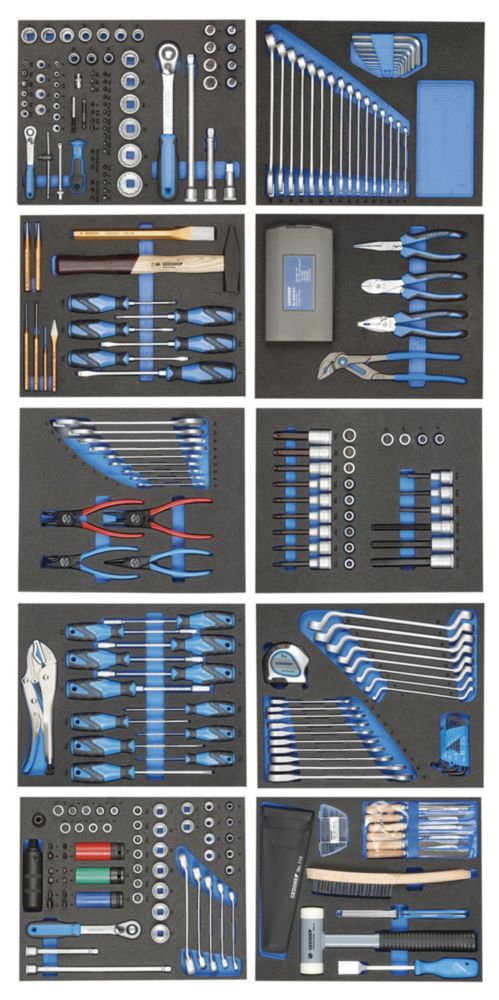 Jedes Werkzeug liegt verrutschsicher in eigener Aussparung, durch Griffmulden leicht herausnehmbar