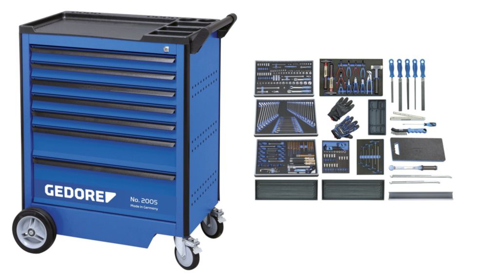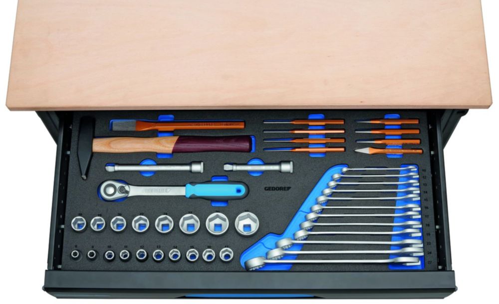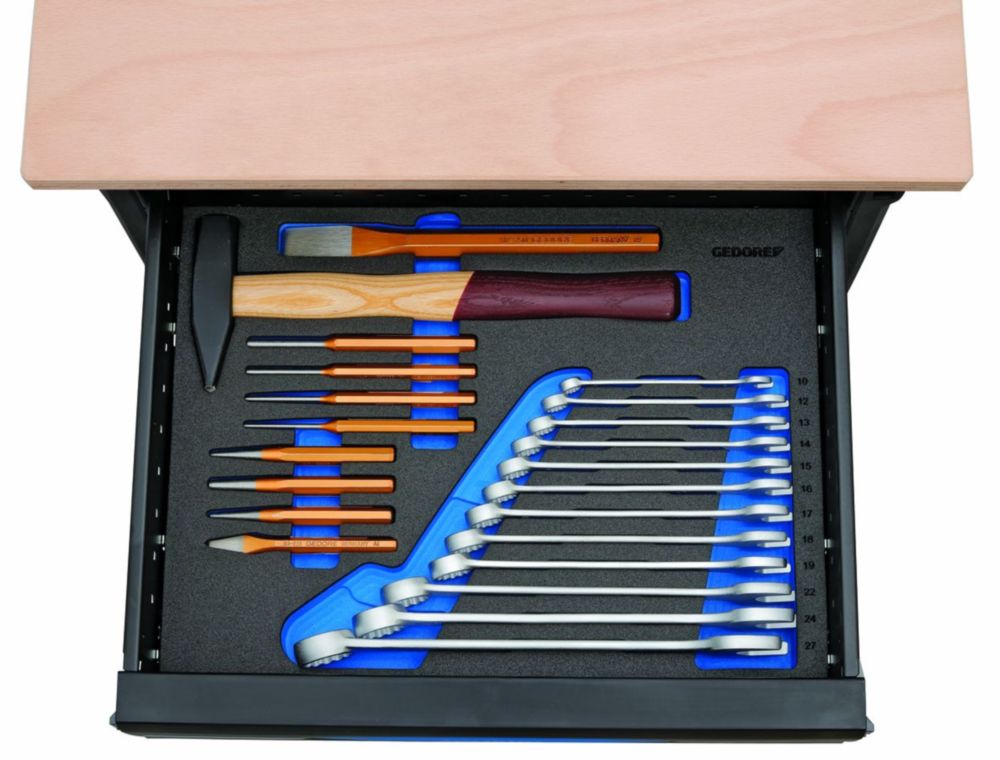 Vorhandene GEDORE Werkzeugwagen 2005, Aufsatztruhe 2430 und Rollwerkbank 1504 XL können mit den einzelnen Check-Tool Einlagen inklusive Werkzeug nachgerüstet werden.