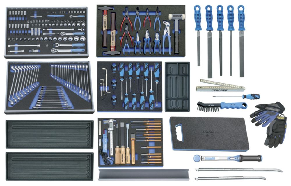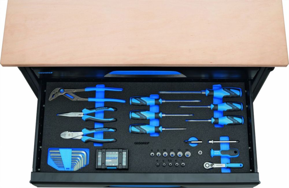 Geliefert in 1500 ES-Modulen, geeignet zur Aufnahme in 5 Schubfächern der GEDORE Werkzeugwagen (z. B. workster) bzw. Werkbänke