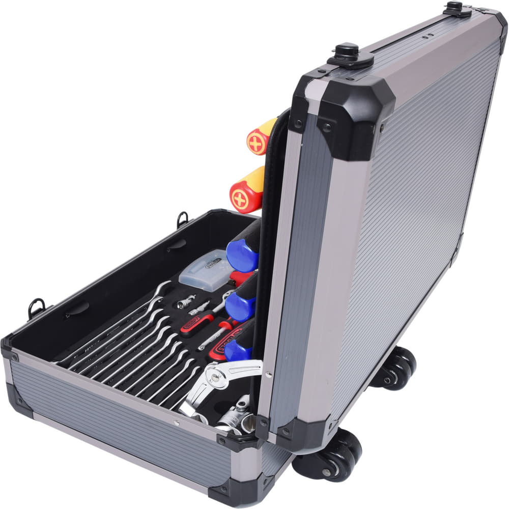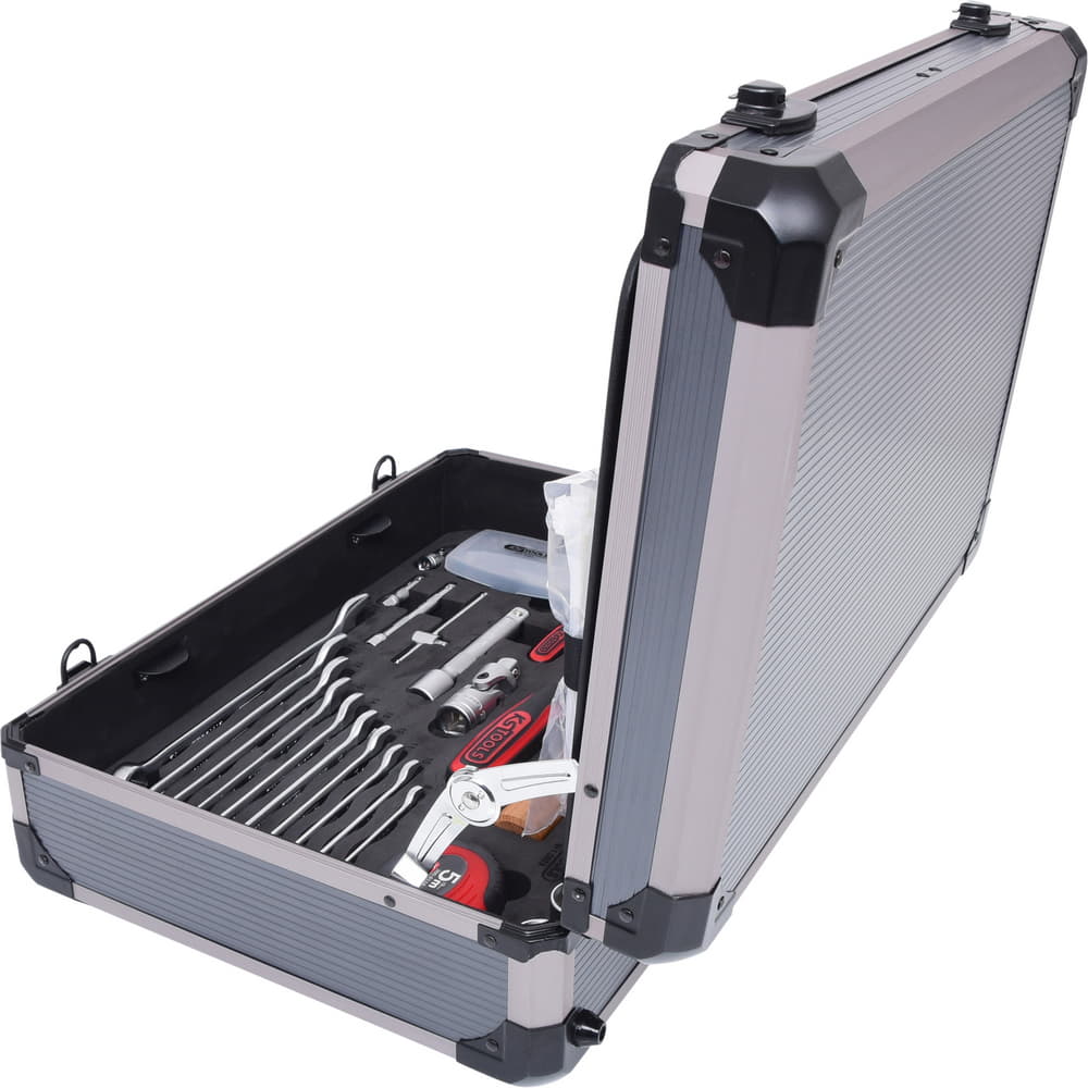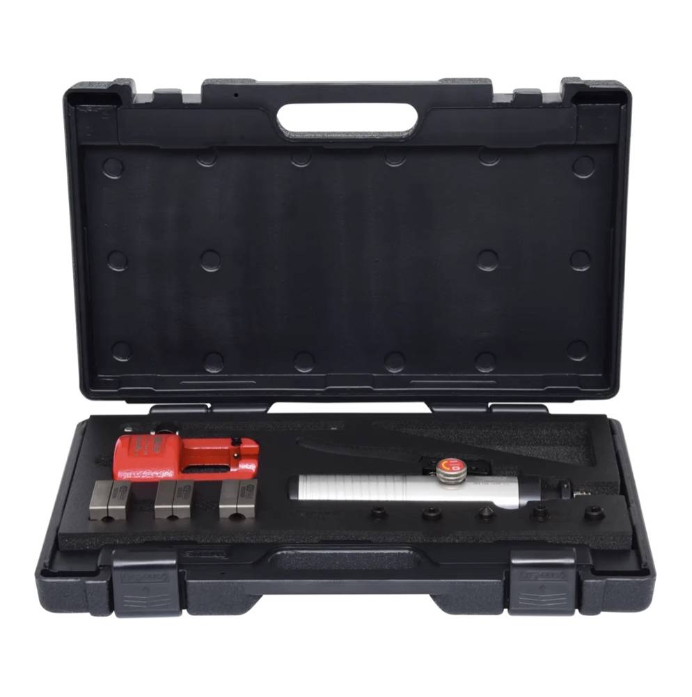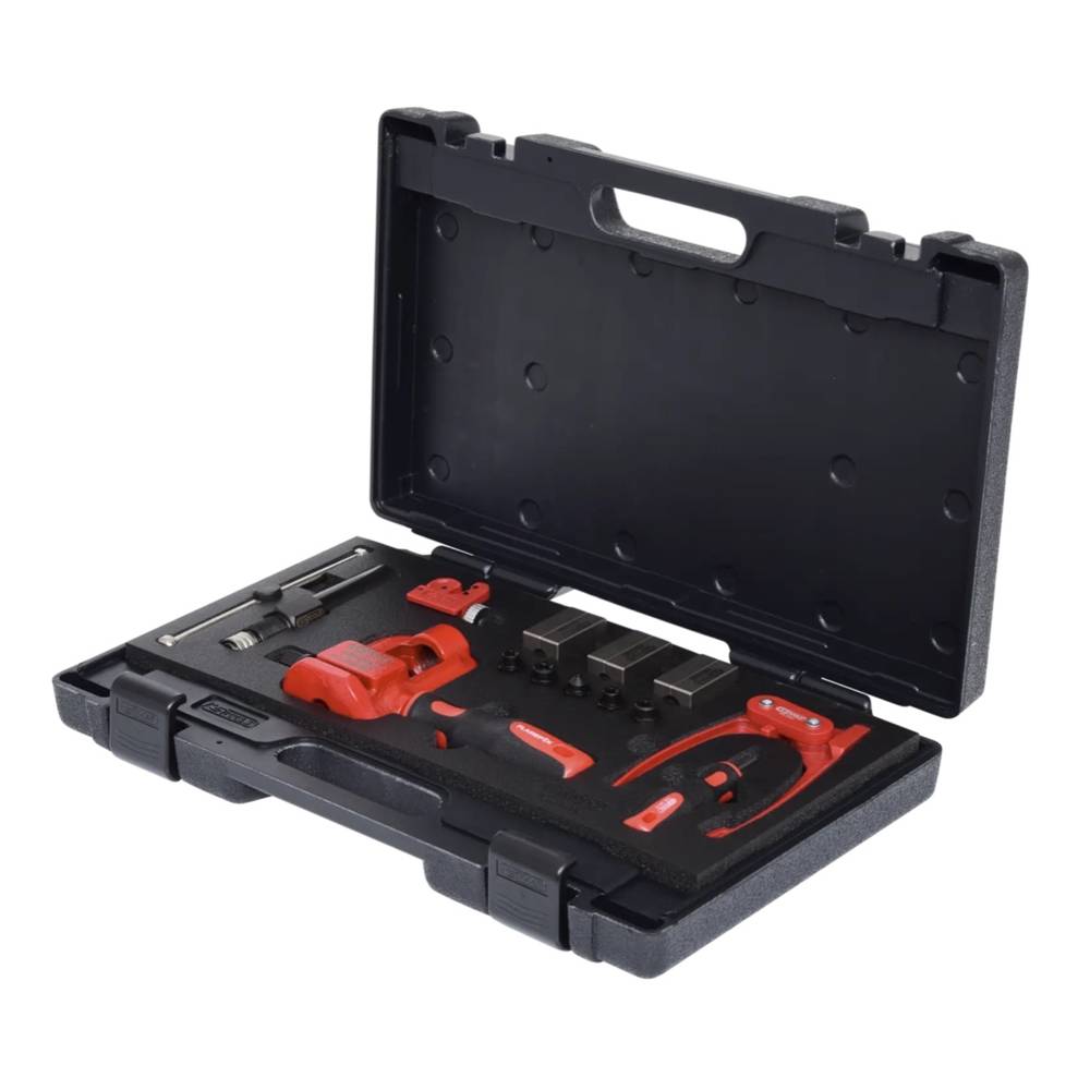 Das Flarefix 1 von KS Tools ist ein leichtes und handliches Universal Bördelgerät welches direkt am Fahrzeug eingesetzt werden kann. Es ist ideal zum Bördeln von dünnwandigen Stahl-, Aluminium-, Kupferleitungen und Brems- bzw. Hydraulikleitungen geeignet. Mit der Hydraulik-Druckspindel lassen sich Konvex und Doppelbördelungen anfertigen. Die geradlinige Bördelbewegung führt zu einem schnellen und präzisen Arbeitsergebnis. Dabei sind keine Beschädigungen an beschichteten Leitungen und kein Aufbrechen der Leitung beim Bördelvorgang möglich. Um eine fachgerechte Bördelung gewährleisten zu kommen, liegen diesem Set ein Abschneider, Bieger und Rohrentgrater bei. Der stabile Transportkoffer sorgt für eine platzsparende und saubere Verstauung aller Anbauteile. KS Tools ist einer der international führenden Anbieter von Werkzeugen und Werkstatteinrichtungen im Fahrzeugbereich und weisen eine lange Tradition mit einem hohen Qualitätsstandard auf.