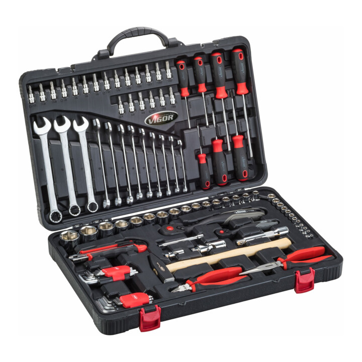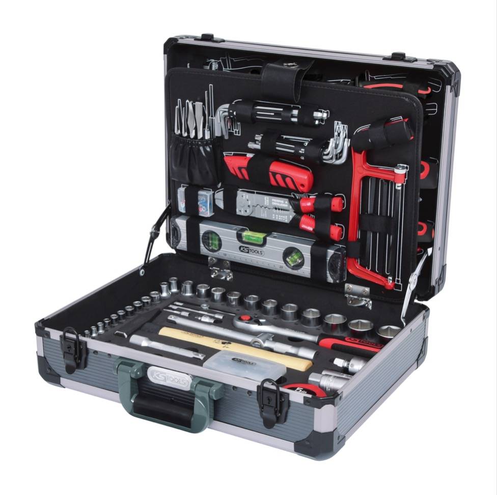 Die Firma KS Tools bietet hier einen gut sortierten Werkzeugkoffer, mit vielen verschiedenen Werkzeugen um diverse anfallenden Aufgaben lösen zu können. Die Werkzeuge sind aus rostfreiem Chrom Vanadium Stahl gefertigt, was eine hohe Stabilität und Langlebigkeit bedeutet. Die Werkzeuge lagern in einem gut sortierten und robusten Koffer um einen einfach Transport und Lagerung zu ermöglichen. KS Tools ist ein führender Hersteller für Handwerkzeuge aller Art und zeichnet sich vor allem durch seine lange Tradition und hohe Verarbeitungsqualität auszeichnet.