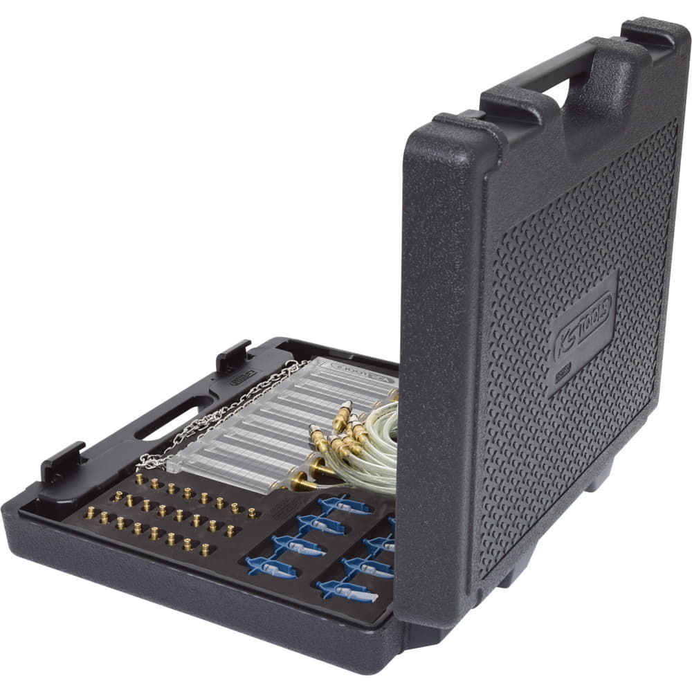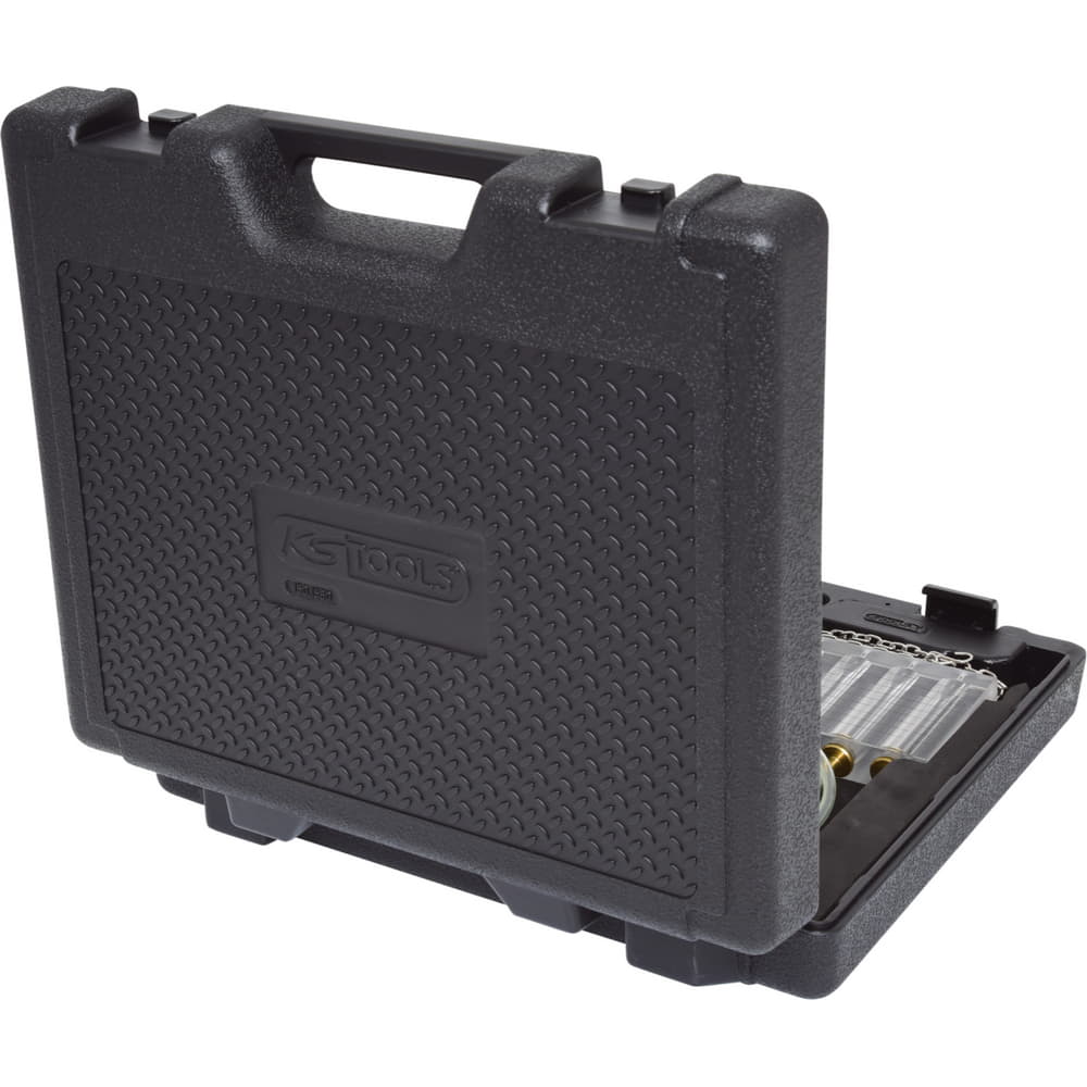 Der BRILLIANT TOOLS Injektor-Auszieher-Satz BT551010 ist ein spezieller Werkzeugsatz zum sicheren Entfernen von Dieselinjektoren, ohne dass der Zylinderkopf ausgebaut werden muss. Durch die zahlreichen Adapter eignet sich dieses Set für die meisten Dieselinjektoren von Kraftfahrzeugen und ist vor allem im kommerziellen Werkstattbetrieb von hohem Nutzen. Doch auch Autodidakten können mithilfe dieses Abziehersatzes einen sicheren Ausbau der Dieselinjektoren ohne Schäden durchführen. Gehen Sie den sichersten Weg mit dem BRILLIANT TOOLS Injektor-Auszieher-Satz. Da dieser Werkzeugsatz eine Vielzahl an Werkzeugteilen und Adaptern beinhaltet, kann das Set bei den meisten Dieselmotoren zum Einsatz kommen. Mit dem professionellen Abzieher-Satz sind Sie für alle Reparaturen an diversen Injektoren unterschiedlicher Größe perfekt ausgerüstet. So können verkokte Injektoren professionell ausgebaut werden. Die drei verschiedenen Gleithämmer sind aus verchromtem Stahl gefertigt und überzeugen mit einer höheren Korrosionsresistenz. Das komplette Set ist in einem praktischen Kunststoff-Werkzeugkoffer untergebracht, der für jedes Einzelteil eine Aussparung besitzt. So kann jedes Werkzeugelement nach Gebrauch sicher und ordentlich verwahrt werden. Der Koffer lässt sich dank des Tragegriffes bequem transportieren, während Clips den Inhalt stark festhalten. Dank der hochwertigen Werkzeugverarbeitung, der Vielzahl an einzelnen Adaptern und drei verschiedenen Gleithämmern liefert das Abzieher-Set alles, was Sie für eine professionelle und einfache Demontage von Dieselinjektoren benötigen. Das Dieselinjektor-Abzieher-Set darf daher als Profi-Werkzeugsatz in keiner Werkstatt fehlen.