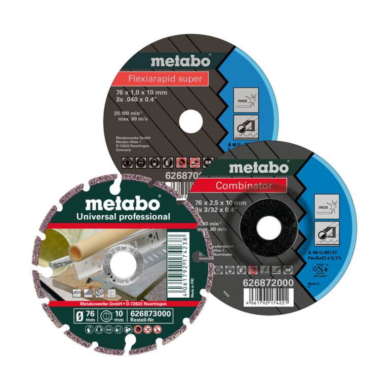 - Starterset bestehend aus: Trennscheibe Flexiarapid Super Inox Ø 76x1,0x10 mm, Trenn-/Schruppscheibe Combinator Ø 76x2,5x10 mm, Diamanttrennscheibe Universal professional Ø 76x10 mm