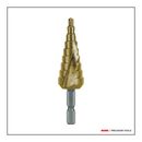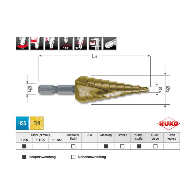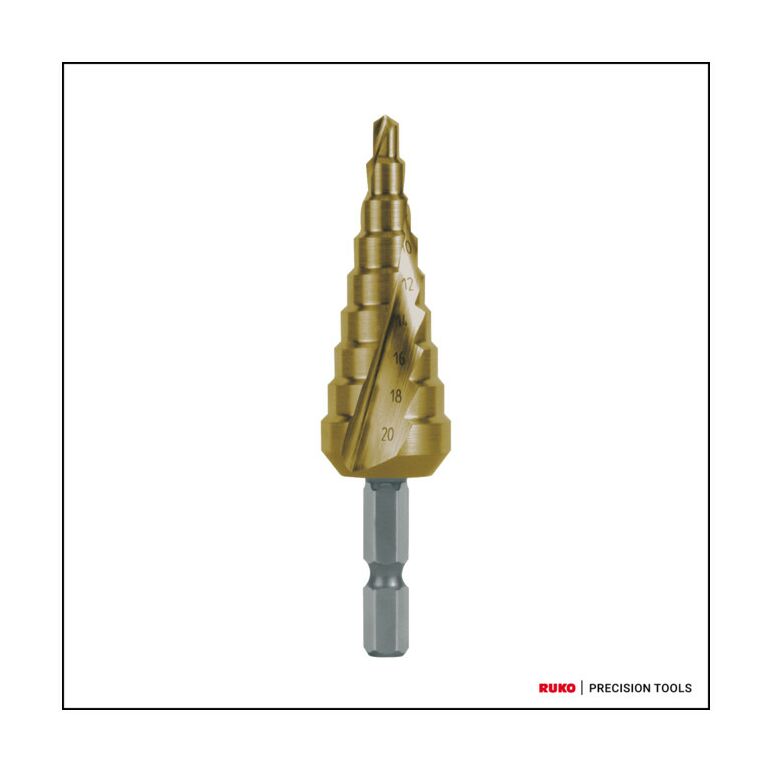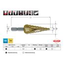 RUKO Stufenbohrer-Bit HSS-TiN, spiralgenutet mit Kreuzanschliff Bohrbereich Ø1 - Ø2 4,0 - 20,0 mm