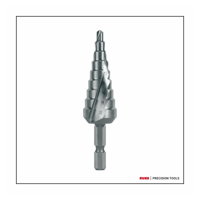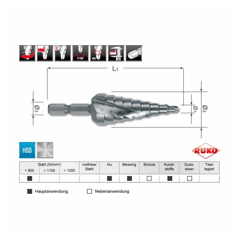 RUKO Stufenbohrer-Bit HSS, spiralgenutet mit Kreuzanschliff Bohrbereich Ø1 - Ø2 4,0 - 30,0 mm