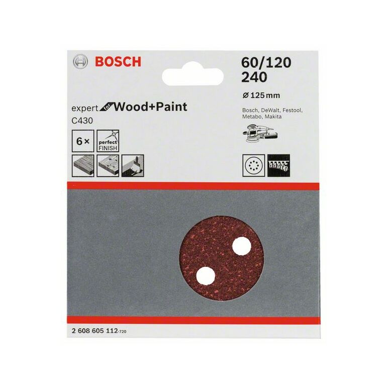 Bosch Schleifblatt C430, 125 mm, 60, 120, 240, 8 Löcher, Klett, 6er-Pack (2 608 605 112)
