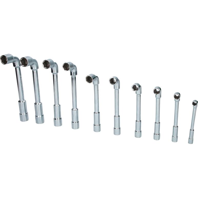 Der 10-teilige BRILLIANT TOOLS Pfeifenkopfschlüssel-Satz BT015100 wird aus Chrom Vanadium Stahl im Gesenk geschmiedet, anschließend gehärtetist und ist eine praxiserprobte Zusammenstellungen von Pfeifenkopfschlüsseln. Der metrische Doppel-Steckschlüssel ist auf einer Seite um 90° gekröpft, um auch tiefer liegende Schraubfälle spielend leicht zu lösen. Die Oberfläche ist für einen verbesserten Rostschutz verchromt und nach DIN 838 gefertigt, dadurch sitzt er auch besonders gut in der Hand. Besonders geeignet sind diese Schlüssel für Stehbolzen und tiefliegende Muttern. Die kurze Seite ist gebohrt zum Einstecken von Drehstiften.