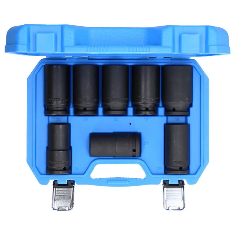 Der 8-teilige BRILLIANT TOOLS Kraft-Stecknuss -Satz BT025600 ist nach DIN 3121 gefertigt. Das gesamte Set hat einen 3/4" (20 mm) Innenvierkant-Antrieb. Es wird in einem praktischen Koffer mit Metallscharnieren und Verschlüssen mit klemmgesicherten Werkzeugen geliefert. Die Beschriftung im Koffer ermöglicht ein rasches Finden der passenden Einsätze. Der Kraft-Stecknuss-Satz ist in der Kfz-Werkstatt oder bei Baumaschinen einsetzbar. Er ist für den Betrieb mit einem Druckluft- oder Akku Schlagschrauber, Knarre oder Drehmomentschlüssel etc. geeignet. Die insgesamt 8 Kraft-Stecknüsse sind aus qualitativem Chrom-Molybdän-Stahl gefertigt und sind mit einer Aufnahme für einen Verbindungsstift und Gummiring ausgestattet. Im Satz enthalten sind die Größen von 24 mm bis 36 mm mit einer Gesamtlänge von 90 mm. Die Oberfläche ist phosphatiert und bietet so höchsten Korrosionsschutz.