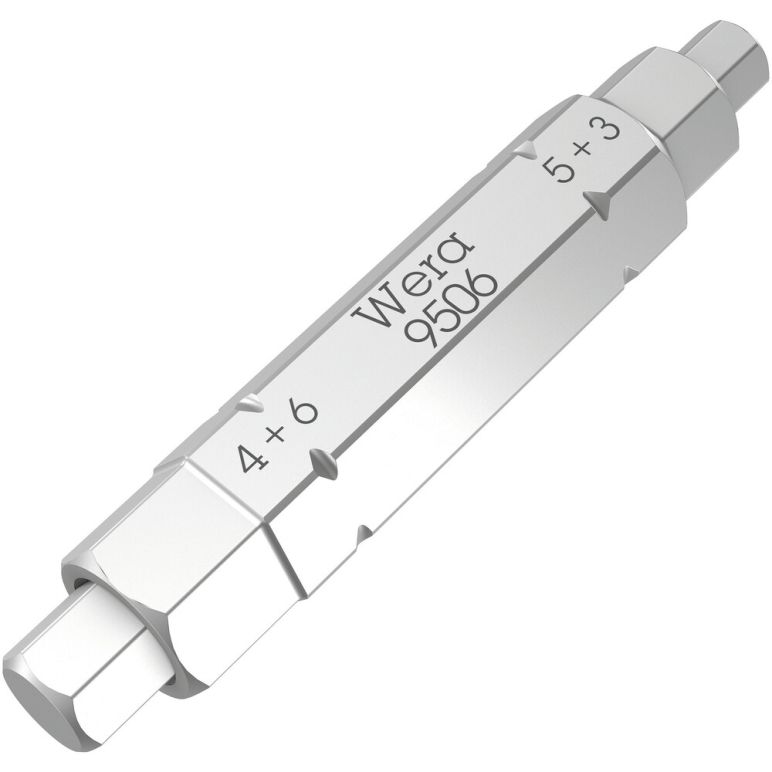 Mit nur einem Bit werden vier verschiedene Schraubprofile (Innensechskantschrauben Größen 3,0, 4,0, 5,0, 6,0) betätigt. Deutliche Gewichteinsparung von über 50 %. Die Funktionsfähigkeit der großen Profile wird durch die einfedernden kleinen Abtriebe ermöglicht. Der Bit hat einen 1/4" Sechskant-Antrieb (Wera Anschluss-Reihe 1) und ist somit auch mit z. B. Bit-Ratschen und Bits-Handhaltern mit Rapidaptor einsetzbar.