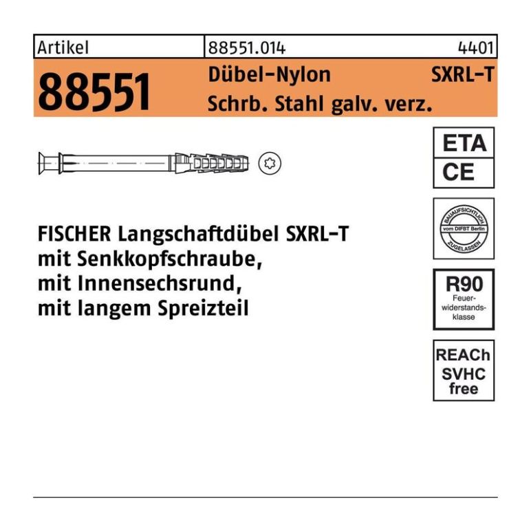 Langschaftdübel R 88551 SXRL 10x230 T Schr.Sta verz./Dübel-Nylon 50St. FISCHERArtikel 88551 Dübel-Nylon SXRL-T Schrb. St. galv. verz. FISCHER Langschaftdüb. SXRL-T mit Senkkopfschraube · Innensechsrund - Abmessung: SXRL 10 x230 T VE=S (50 Stück) Weitere technische Eigenschaften: · Gruppencode: 88551.014 · Norm: REYHER-Artikel 88551