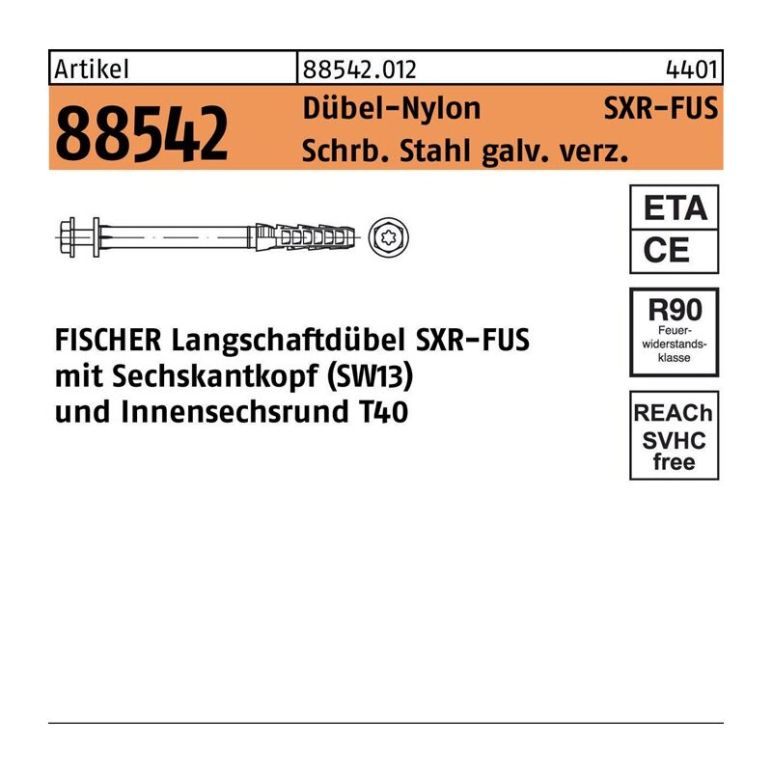 Rahmendübel R 88542 SXR 10x 80 FUS Schraube Sta verz./Dübel-Nylon 50St. FISCHERArtikel 88542 Dübel-Nylon SXR-FUS Schrb. St. galv. verz. FISCHER Langschaftdübel SXR-FUS mit Sechskantkopf (SW13) und ISR T40 - Abmessung: SXR 10x 80 FUS VE=S (50 Stück) Weitere technische Eigenschaften: · Material: Schraube Stahl, galvanisch verzinkt/Dübel-Nylon · Gruppencode: 88542.012 · Norm: REYHER-Artikel 88542