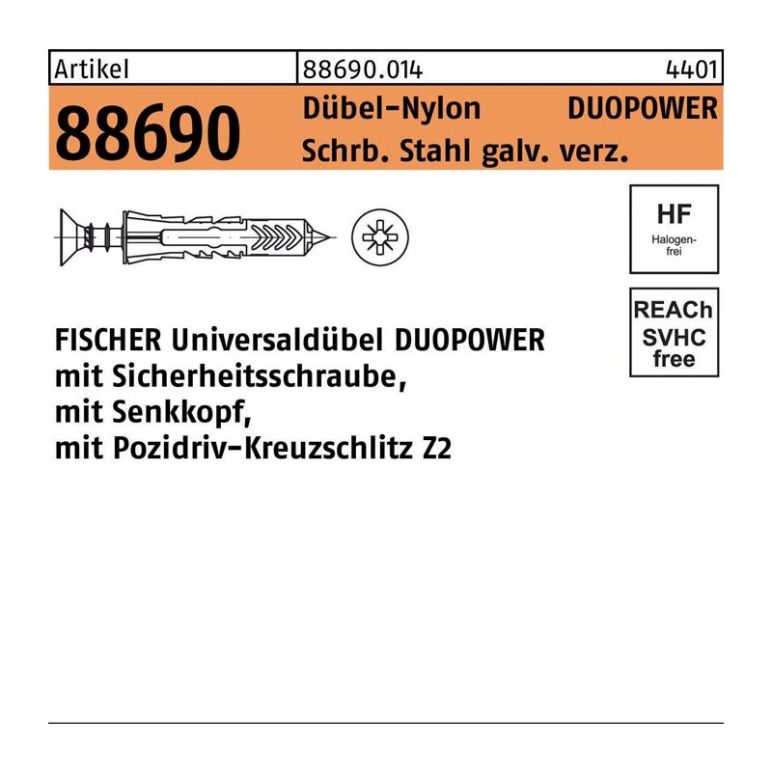 Dübel R 88690 SEKO-Schr. DUOPOWER 8x40 S Schr.verz./Dübel-Nylon 50St. FISCHERArtikel 88690 Dübel-Nyl. DUOPOWER Schrb. St. galv. verz. FISCHER Dübel DUOPOWER Senkschraube mit Kreuzschlitz -Z - Abmessung: DUOPOWER 8 x 40 S VE=S (50 Stück) Weitere technische Eigenschaften: · Werkstoff: Schraube Stahl, galvanisch verzinkt/Dübel-Nylon · Durchmesser: 8 mm · Gruppencode: 88690.014 · Norm: REYHER-Artikel 88690 · Produkt-Typbezeichnung: FISCHER Universaldübel DUOPOWER mit Sicherheitsschraube, mit Senkkopf, mit Pozidriv-Kreuzschlitz Z2