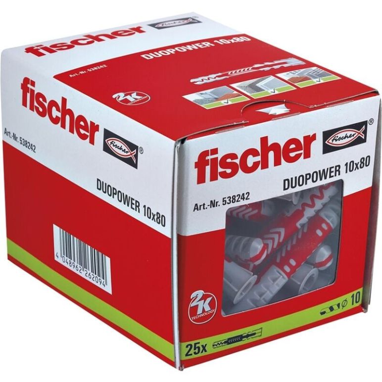 fischer DUOPOWER 10 x 80, 25er Pack Universaldübel ? preisgekrönt mit dem German Design Award 2018Der fischer DUOPOWER ist der erste intelligente und selbst aktivierende Dübel. Er besitzt zwei Funktionsprinzipien, die er je nach Baustoff automatisch einsetzen kann: spreizen oder klappen. Somit ist er in Voll- und Lochbaustoffen vielseitig einsetzbar und leitet höchste Lastwerte ein. Seine zwei Materialkomponenten sind die beste Kombination für maximale Power und Funktion: Die graue Komponente aus hochwertigem Nylon aktiviert je nach Baustoff automatisch das optimale Funktionsprinzip für besten Halt. Die Expansionsflügel der roten Komponente unterstützen die sichere Verspreizung und bieten zusätzliche Sicherheit zur grauen Komponente. Dank der bestmöglichen Rückmeldung spüren Sie sofort, wenn der Dübel perfekt sitzt. Eine Mitdrehsicherung sowie der schmale Rand, der das Durchrutschen ins Bohrloch verhindert, erleichtern das Arbeiten ungemein. So überzeugt der DUOPOWER sowohl Profis als