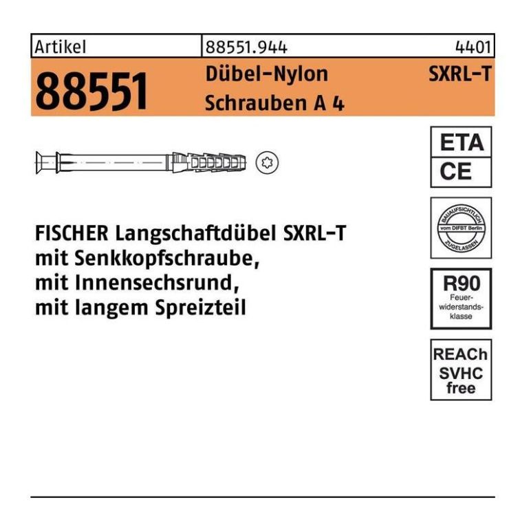 Artikel 88551 Dübel-Nylon SXRL-T Schrauben A 4 FISCHER Langschaftdüb. SXRL-T mit Senkkopfschraube · Innensechsrund - Abmessung: SXRL 10 x230 T VE=S (50 Stück) Weitere technische Eigenschaften: · Gruppencode 88551.944· Normart REYHER-Artikel 88551 Inhaltsmenge: 50 Stück pro Kartonage Bohrer-Ø d0 10 Dübellänge l 230 Ausführung FISCHER Langschaftdübel SXRL-T mit Senkkopfschraube, mit Innensechsrund, mit langem Spreizteil Verpackungsgröße 50.00 Werkstoff Schrauben A 4/Dübel-Nylon Typ SXRL-T